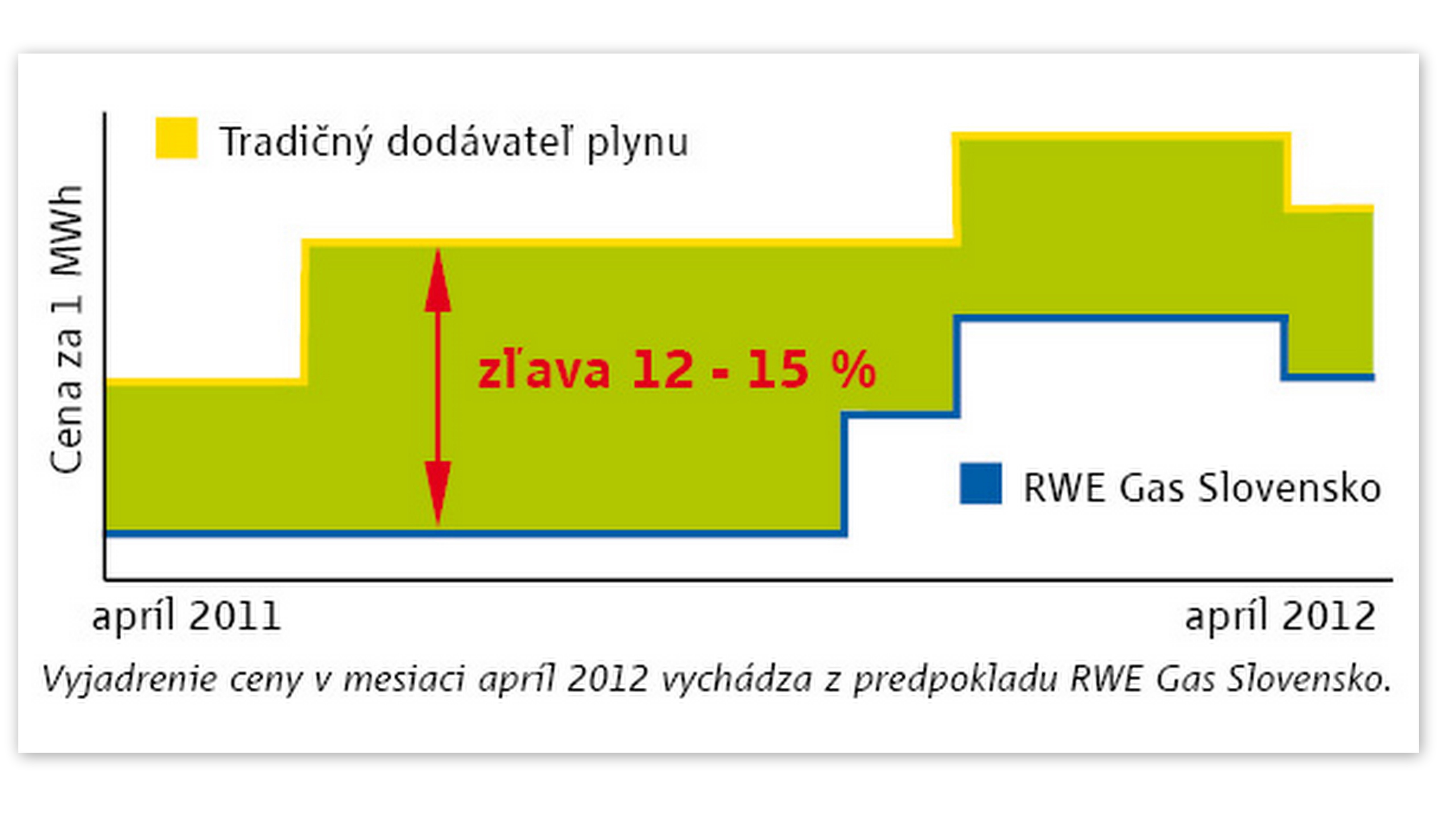 V mesiacoch júl až október 2011 to bolo dokonca 15 %, čo vtedy neponúkal žiaden iný alternatívny dodávateľ. Bolo to v čase, keď tradičný dodávateľ zvýšil ceny a RWE Gas Slovensko v záujme zákazníka podržala ceny najdlhšie ako mohla.
