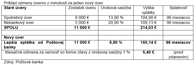 Zároveň by chceli pôžičku získať čo najrýchlejšie, ideálne bez zložitej administratívy a bez ručiteľa. Taký je aj konsolidačný úver Lepšia splátka od Poštovej banky, s ktorým môžu klienti počas celého obdobia splácania ušetriť stovky eur. Ak si zoberieme príklad uvedený ďalej, rodina splácala úvery vo výške 11 tisíc eur a mesačne zaplatila na splátkach 214,03 eura. S novým úverom od Poštovej banky by sa jej nielen sprehľadnilo splácanie pôžičiek, ale rodina by získala nižšiu úrokovú sadbu a nižšie mesačné splátky, ktoré by odľahčili rodinný rozpočet. Každý mesiac by tak ušetrila takmer 64 eur a ročne až 768 eur. Navyše klient, ktorý aktívne využíva svoj osobný účet v Poštovej banke, získa každý mesiac odmenu za vernosť vo forme zľavy z úrokovej sadzby na úrovni 1 percenta. V tomto prípade by rodina dostala každý mesiac späť 5,40 eura, ktoré už môže minúť na čokoľvek.