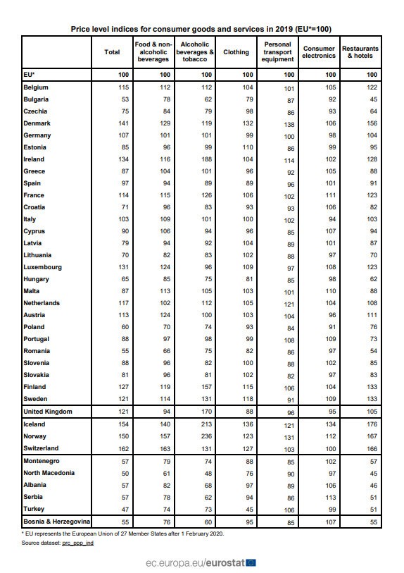 SLOVENSKO/EURÓPA / Slovensko je deviatou najlacnejšou krajinou v rámci 27 členských štátov Európskej únie. Medziročne si tak podľa údajov Európskeho štatistického úradu Eurostat za minulý rok pohoršilo o jednu priečku. Dôvodom sú vyššie ceny potravín, oblečenia a topánok. Ako sú na tom v porovnaní s nami ostatné krajiny EÚ, no aj tie mimo únie za rok 2019?