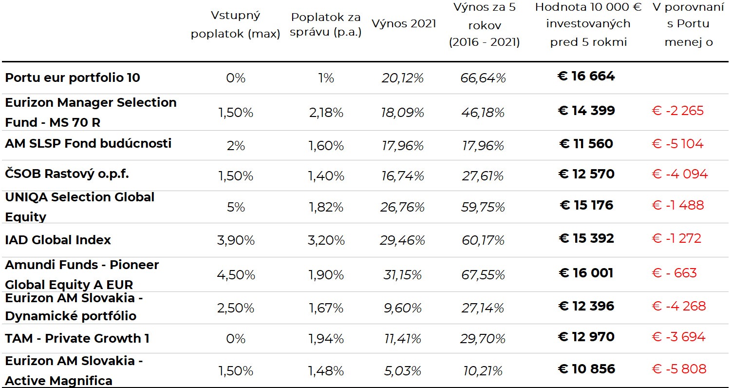 Fakt, že aktívne spravované portfóliá majú z dlhodobého hľadiska nižší výkon ako veľké indexy, ktoré sa snažia prekonať, potvrdzujú aj dáta organizácie S&P Global publikované v reporte SPIVA. Vďaka širokej diverzifikácii danej nástrojmi ETF tak dokáže Portu svojim užívateľom priniesť lepší čistý výnos ako konkurencia. Dokazuje to aj veľké porovnanie investičných platforiem, kde Portu portfólio 10 za 5 rokov s prehľadom prekonalo najväčšie slovenské podielové fondy.