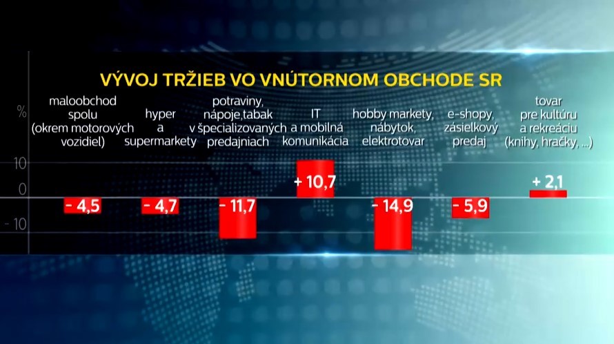 Maloobchodné tržby zaznamenali celoročný rekordný pokles, a to na úrovni 4,5 percenta, čo je najhorší výsledok za 14 rokov. "Väčší prepad maloobchod ako celok zaznamenal naposledy v roku 2009, keď bola finančná kríza," informovala Jana Morháčová, hovorkyňa Štatistického úradu SR.