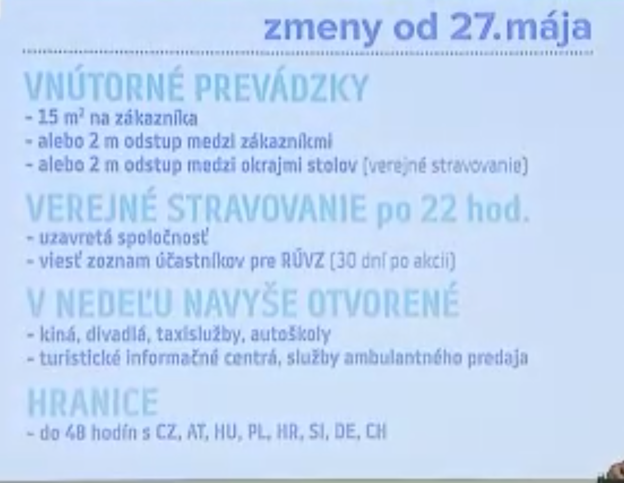 - Vnútorné prevádzky- budú si môcť vybrať z troch možností: 1. 15 metrov štvorcových na zákazníka / 2. dvojmetrový rozostup medzi zákazníkmi / 3. dvojmetrový odstup od krajov stolov ( pri stravovacích zariadeniach). Pravidlo 2 rodinní príslušníci alebo 2 + deti stále platí.