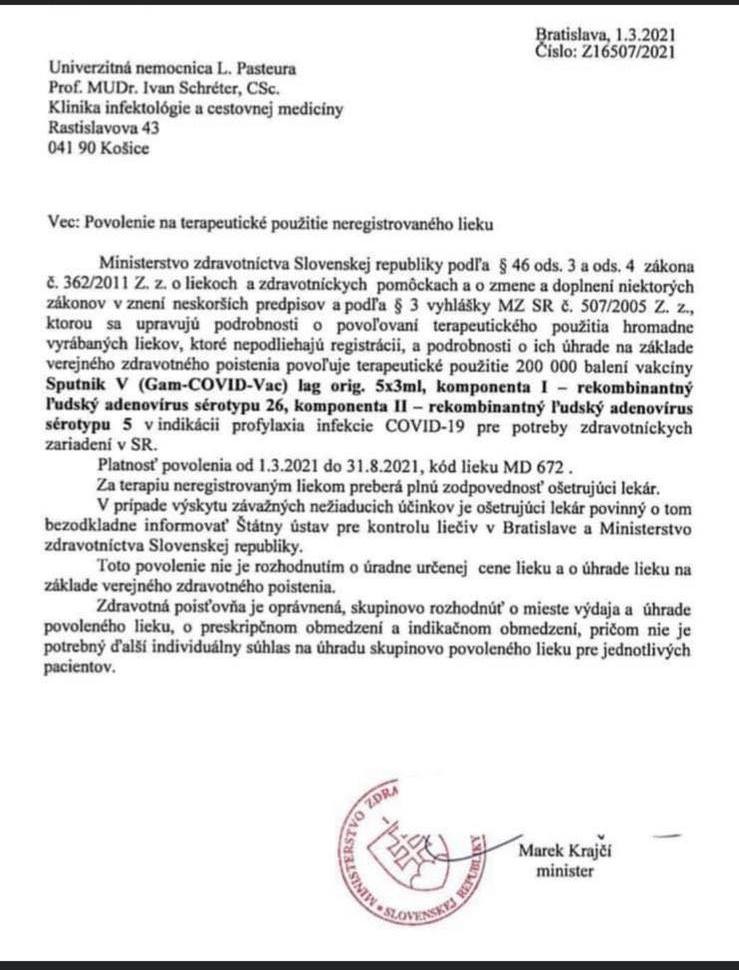 BRATISLAVA / Minister zdravotníctva Marek Krajčí už povolil použitie ruskej vakcíny Sputnik V. Dokument z Univerzitnej nemocnice L. Pasteura Košice zverejnil rezort na svojej webovej stránke. Minister v ňom povolil terapeutické použitie 200-tisíc balení vakcíny. Povolenie platí od pondelka 1. marca do konca augusta.