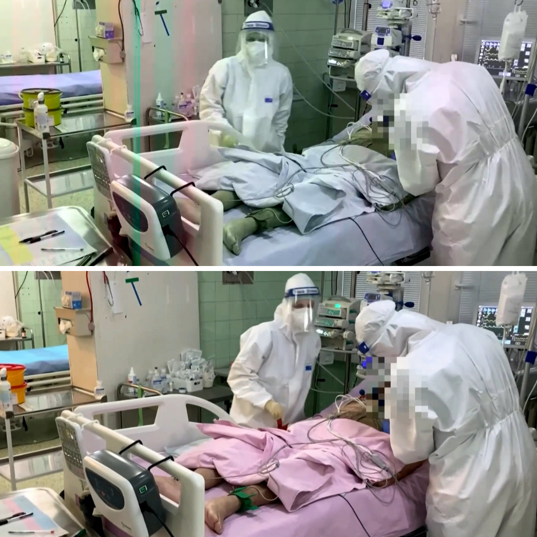 Dôležitým detailom sú aj zelené čiary, ktoré sú prítomné na všetkých záberoch z covidového oddelenia. Rozdiel je viditeľný na celom zábere, nielen na samotnom pacientovi. Zmenu farby vidieť na celom vybavení nemocničnej izby.