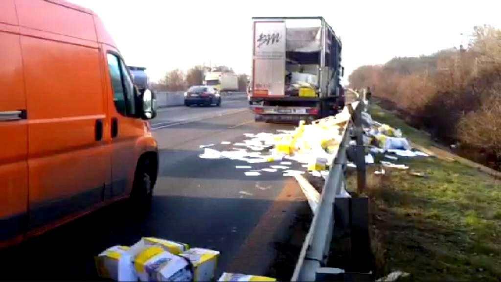 SENEC/BRATISLAVA / Na diaľnici D1 v smere zo Senca do Bratislavy havaroval v pondelok ráno kamión. Nehoda sa stala pri Triblavine a kamión viezol kancelársky papier. Nehoda poriadne skomplikovala dopravu.