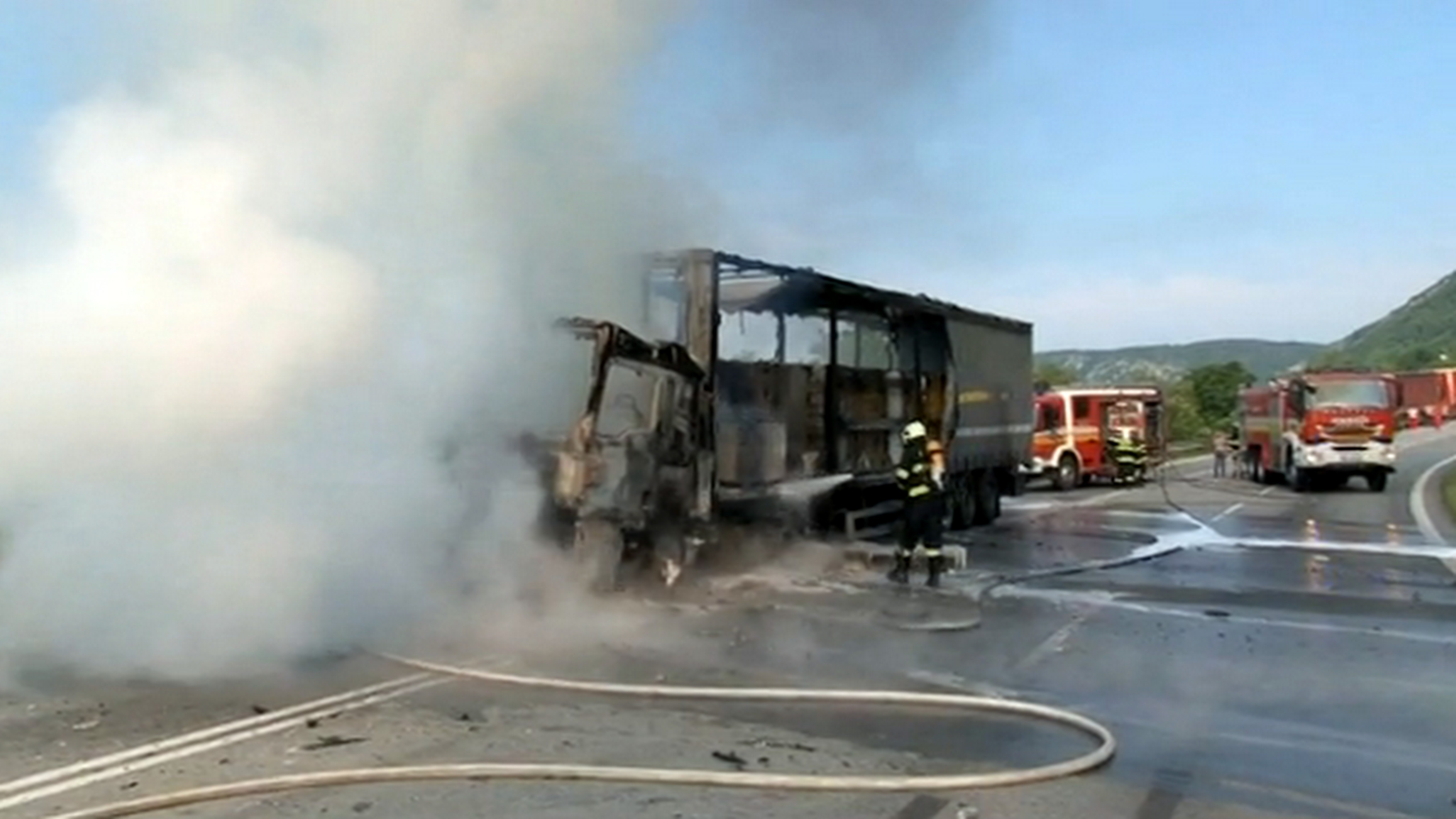 SOROŠKA / na horskom priechode Soroška horel kamión. Plamene pohltili najskôr kabínu, rozšírili sa aj na náves plný stavebného materiálu. Na pomoc museli prísť hasičské cisterny z Rožňavy a Moldavy nad Bodvou. Napriek ich zásahu z kamióna zostala len kopa šrotu.