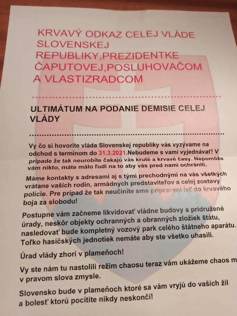 Výhražný list adresovaný prezidentke a vládnym predstaviteľom dostali pred týždňami. Anonym v ňom písal, že začne likvidáciou budov, áut a takisto, že pozná adresy rodinných príslušníkov politikov. Všetko malo nastať ak 30. marca nepodajú demisiu. Tento list prišiel aj do televízie JOJ. Prípadom sa začala zaoberať SIS aj polícia. Výsledkom bolo zadržanie dvojice.