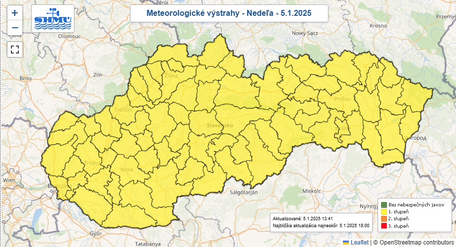 SLOVENSKO / Na Slovensko prichádza výstraha pred nepriaznivým počasím, ktoré nás zasiahne v nedeľu (5. 1.). Po snežení, ktoré bude prevažovať v priebehu dňa, večer dorazí mrznúci dážď. Najkritickejšia situácia sa očakáva v nedeľu večer, preto sa odporúča obmedziť cestovanie autom a zmeniť svoje plány.
