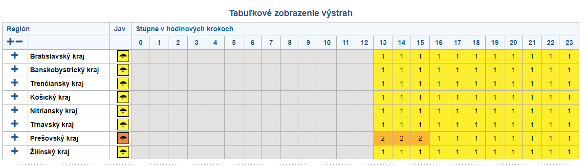 Prvý stupeň výstrah pred búrkami platí na celom území predbežne do 20.00 h. SHMÚ upozorňuje, že sa môžu vyskytnúť búrky spojené s prudkým lejakom s intenzitou dvadsať až tridsať milimetrov za tridsať minút, krúpami a s nárazovým vetrom, ktorý môže dosiahnuť rýchlosť 65 až 85 kilometrov za hodinu. Zároveň pre okresy Spišská Nová Ves a Gelnica platí druhý stupeň výstrahy pred prívalovými povodňami. Prvý stupeň je vydaný pre okresy Levoča, Sabinov a Prešov.