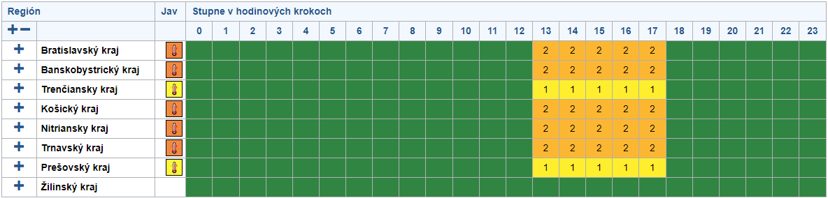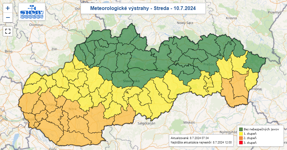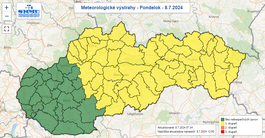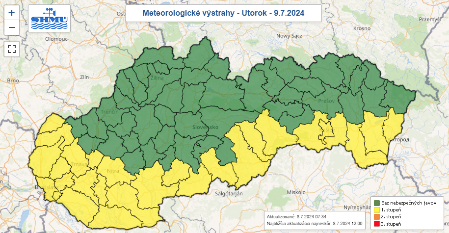 Teplota v noci bude klesať na 17-23°C, v dolinách a kotlinách môže dosiahnuť aj 15°C. Po horúcich, tropických nocách nás čakajú mimoriadne horúce a veľmi dusné dni s teplotami medzi 30 až 36°C. Tieto hodnoty sú nezvyčajne vysoké pre naše územie, ale v posledných rokoch sa u nás objavujú častejšie.