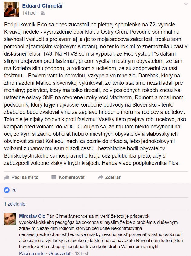 BRATISLAVA / Premiér Fico si za svoj silne protifašistický prejav, ktorý predniesol v nedeľu na spomienkovom podujatí pri príležitosti 72. výročia vypálenia obcí Kľak a Ostrý Grúň, vyslúžil pochvalu od ľudí aj médií, ktoré mu obvykle nevedia prísť na meno. Počas svojho príhovoru použil nezvyčajne tvrdé slová a otvorene kritizoval stranu ĽSNS Mariána Kotlebu. Príhovorom žili aj sociálne siete, kým väčšina vyjadrovala uznanie s dovetkom "konečne", našli sa aj kritické názory. Napríklad na facebookovom profile politického a mediálneho analytika Eduarda Chmelára.