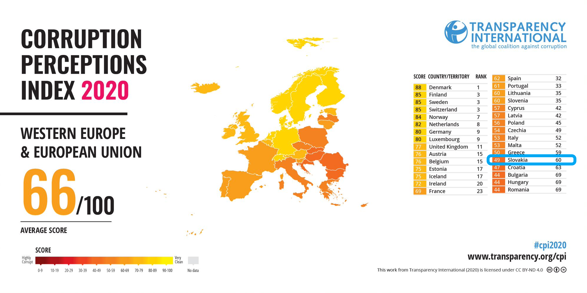 Zhoršenie v indexe podľa odráža slabý boj proti korupcii počas záverečného roka vlády Petra Pellegriniho. Prácu novej vlády Igora Matoviča, ktorá si dala za cieľ zlepšiť sa v rebríčku o 20 miest, odrazí podľa organizácie v plnej miere až tohtoročný index. Slovensko dosiahlo podľa Transparency International v rámci rebríčka 49 bodov zo sto možných, čo je o bod menej ako pred rokom.