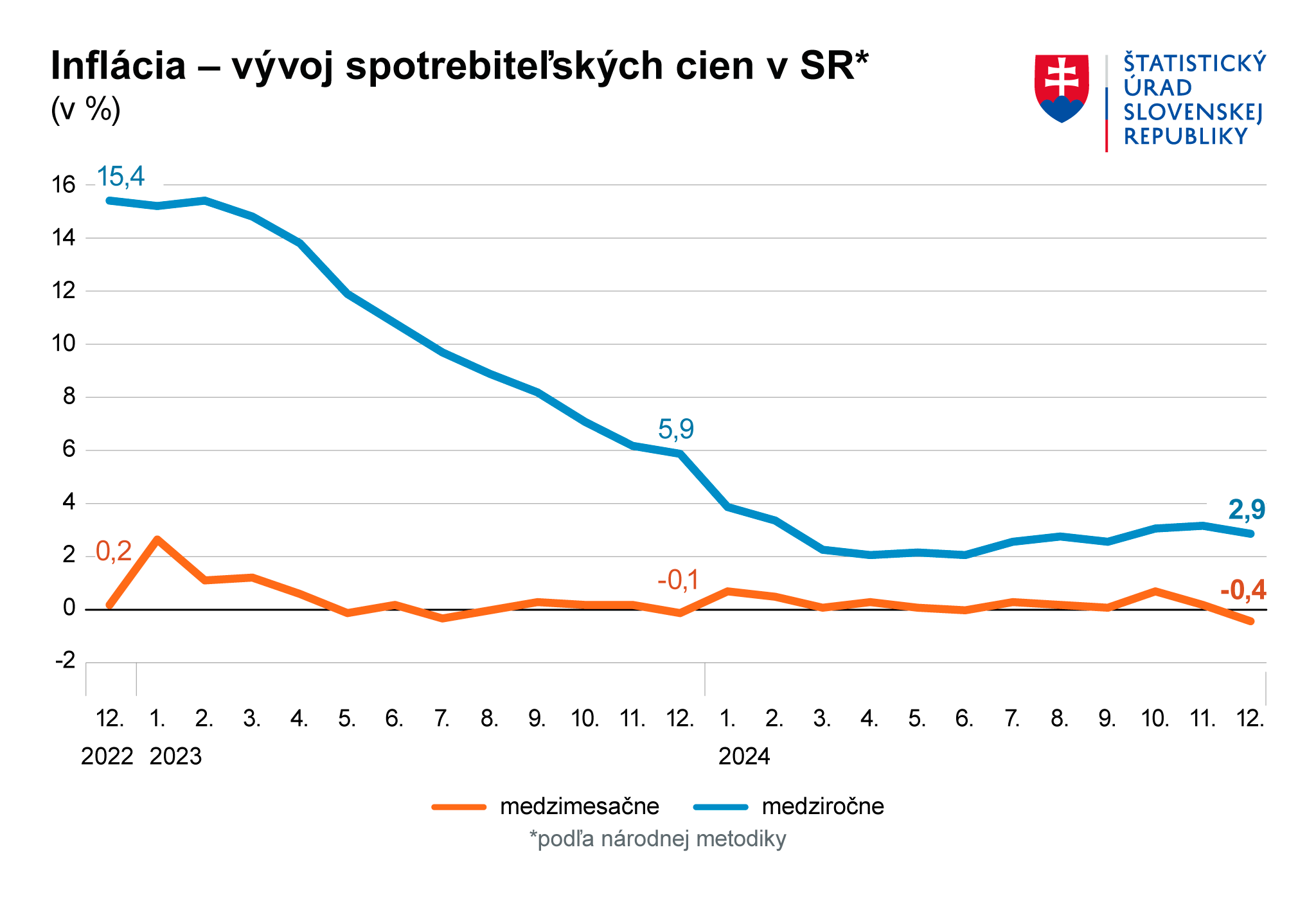 Spotrebiteľské ceny tovarov a služieb v decembri klesli medzimesačne o 0,4 %, čo bol najvýznamnejší medzimesačný pokles za osem a pol roka (od júla 2016). Takýto prudký mesačný pokles cien je rekordom a za posledných 27 rokov sa vyskytol len štyrikrát.