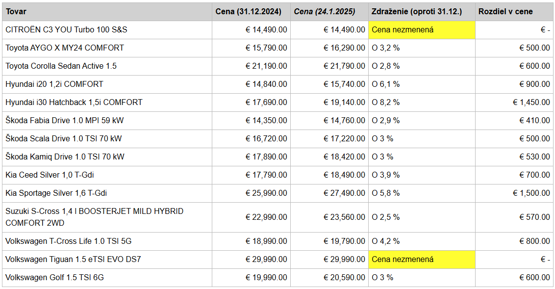 Pri autách je situácia trochu zvláštna. Aj tam išla daň hore plošne o 3 percentá, no každý sa s ňou vyrovnal inak. Tu máme porovnanie troch - na Slovensku pomerne bežných - volieb a ako vidíte, čísla sa značne líšia. "Sme videli naozaj zaujímavé fluktuácie cien, keď jedna položka sa nezmenila vôbec, na druhej strane iný model stúpol až o 1 450 eur." informoval riaditeľ Inštitútu moderného spotrebiteľa Filip Kužma.