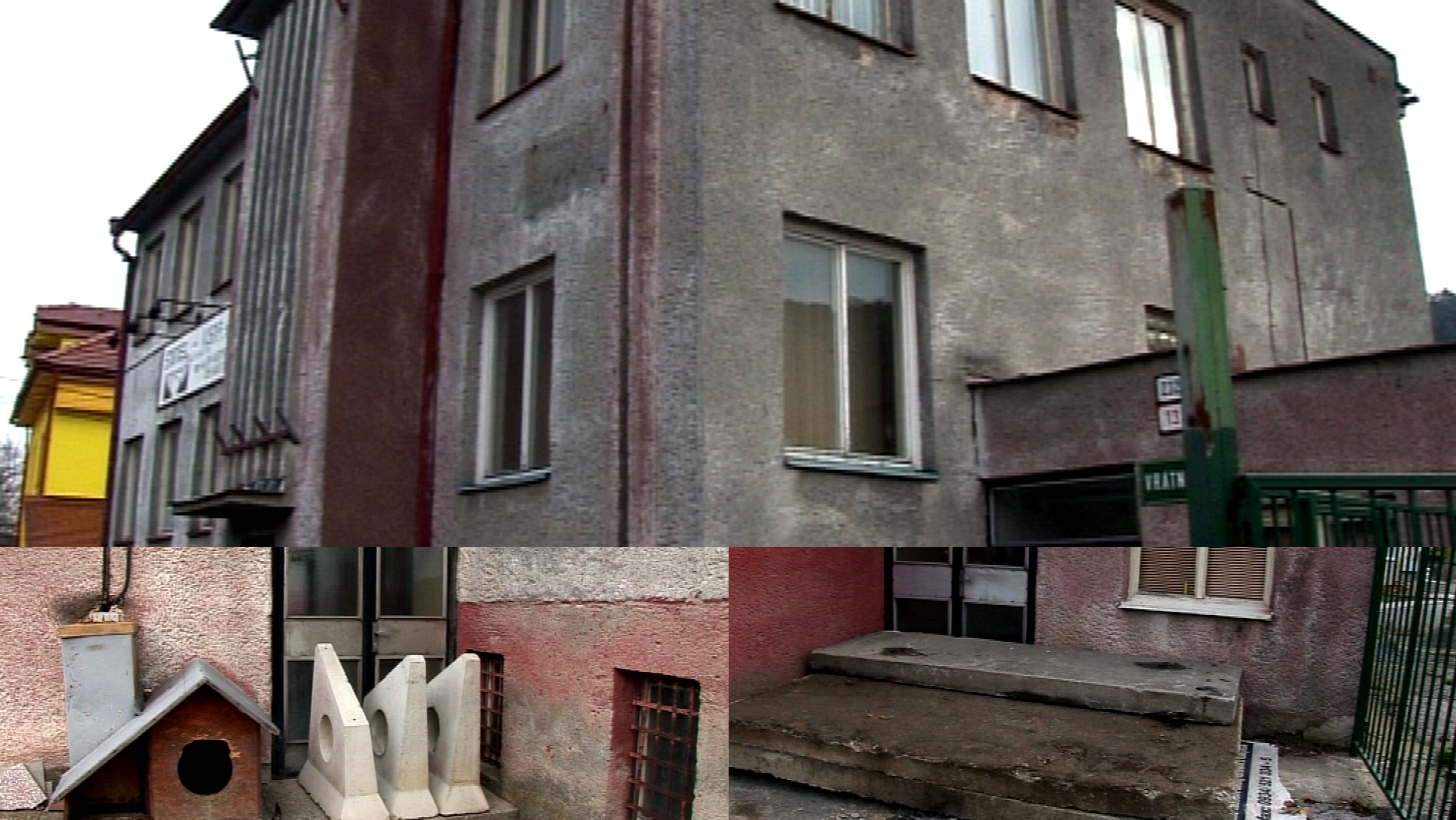 Panely pred vchodom. Ľubomír chodí do kancelárie cez okno