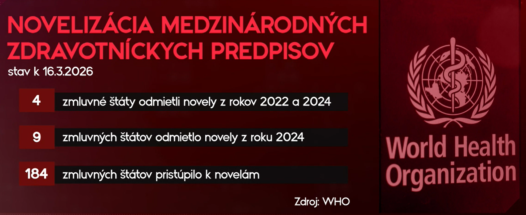 SLOVENSKO / Nedávne rozhodnutie Slovenska odmietnuť novelizované medzinárodné zdravotné predpisy vyvolalo kritiku zo strany lekárskych organizácií. Ide o nové opatrenia členských krajín Svetovej zdravotníckej organizácie po poučení sa z pandémie. Minister Kamil Šaško argumentoval, že medicínska časť dokumentu je v poriadku. Sú tam však právne otázky, ktoré podľa neho treba doriešiť a potom môžeme k novele pristúpiť. V tejto chvíli máme už aj odpoveď od WHO, koľko krajín novelu odmietlo.