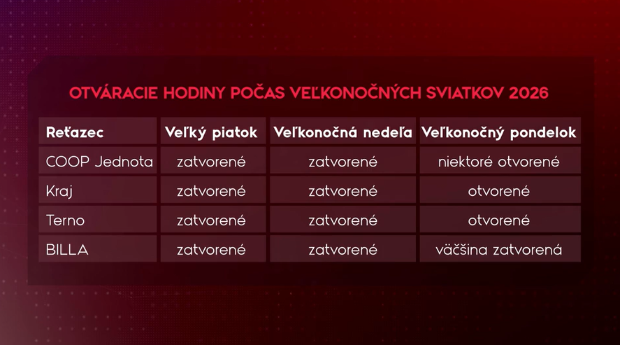 Minulý rok ste počas veľkonočných sviatkov nenakúpili až tri dni. Po novom sa toto obdobie skracuje a zo zákona musia byť obchody zatvorené už len dva dni. "Na Veľký piatok máme zatvorené, na Bielu sobotu máme otvorené, Veľkonočnú nedeľu máme zatvorené a na Veľkonočný pondelok máme otvorené od deviatej do osemnástej," hovorí Tomáš Bezák, vedúci úseku Corporate Affairs Lidl Slovenská republika. "Predajne v Partizánskom, v Banskej Bystrici, vo Zvolene a v Lučenci budú počas Veľkonočného pondelka zatvorené. Predajne v Bratislave, v Eurovei, v Nitre a v Martine budú podľa štandardných otváracích hodín a ostatné predajne budú otvorené ako v nedeľu," tvrdí Marek Kraviar – hovorca, Billa.