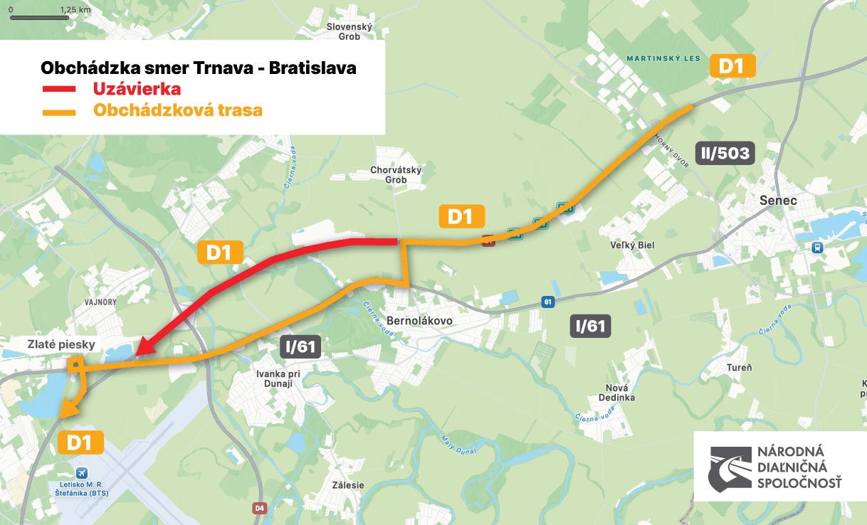 Cesta do hlavného mesta bude v úseku od križovatky Bernolákovo na Triblavine po bratislavské Zlaté Piesky uzatvorená od štvrtka 9. apríla od 22:00 do nedele 12. apríla. Premávka v opačnom smere ostáva bez zmien. Pôvodný termín uzávierky bol naplánovaný na koniec marca, no kvôli zlému počasiu musel byť presunutý.