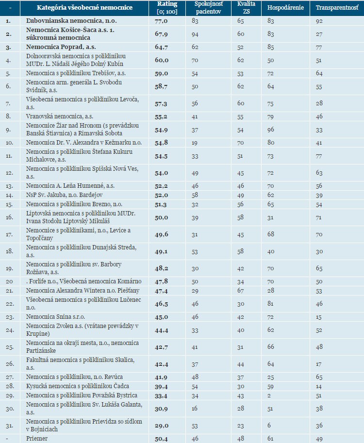 V kategórii všeobecných nemocníc si prvenstvo už druhým rokom drží Ľubovnianska nemocnica, ktorej zriaďovateľom je Prešovský samosprávny kraj a mesto Stará Ľubovňa. Môže sa pochváliť spokojnými pacientmi, ktorí takmer nedávajú sťažnosti a vo svojej kategórii je najtransparentnejšou nemocnicou.