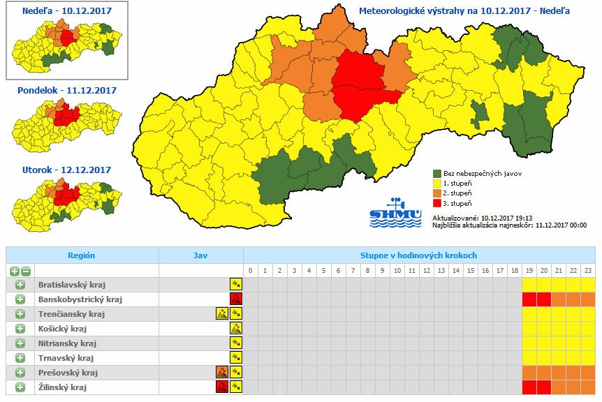 BRATISLAVA / Slovenský hydrometeorologický ústav vydal na nedeľu, pondelok a utorok viacero výstrah. Výstraha 3. stupňa pred vetrom platí pre horské oblasti Banskobystrického a Žilinského kraja. Druhý stupeň pre severovýchod Slovenska. Vietor dosiahne podľa SHMÚ na horách v nárazoch rýchlosť až 50 metrov za sekundu.