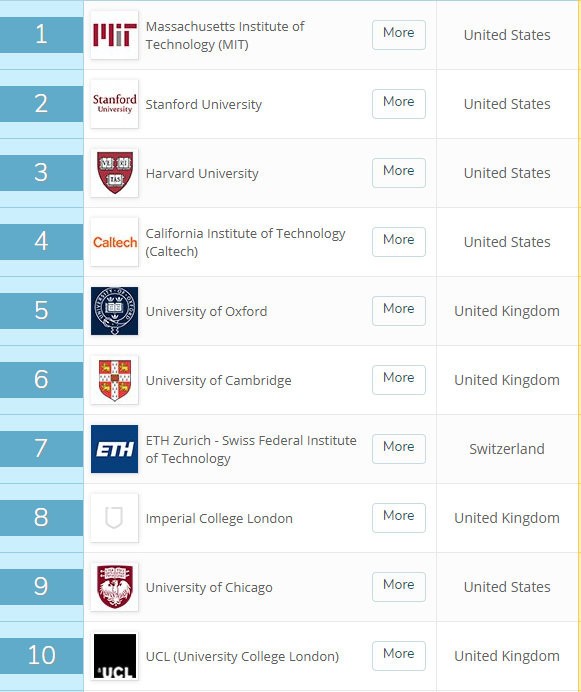 Portál samozrejme hodnotí aj najlepšie univerzity na celom svete. Najlepšia Univerzita na svete je v Amerike, presnejšie v štáte Massachusetts. Reč je o Massachusetts Institute of Technology. Za ňou je Stanford a slány Harvard. Prvá neamerická univerzita obsadila 5. priečku a môžete ju nájsť vo Veľkej Británii - University of Oxford.