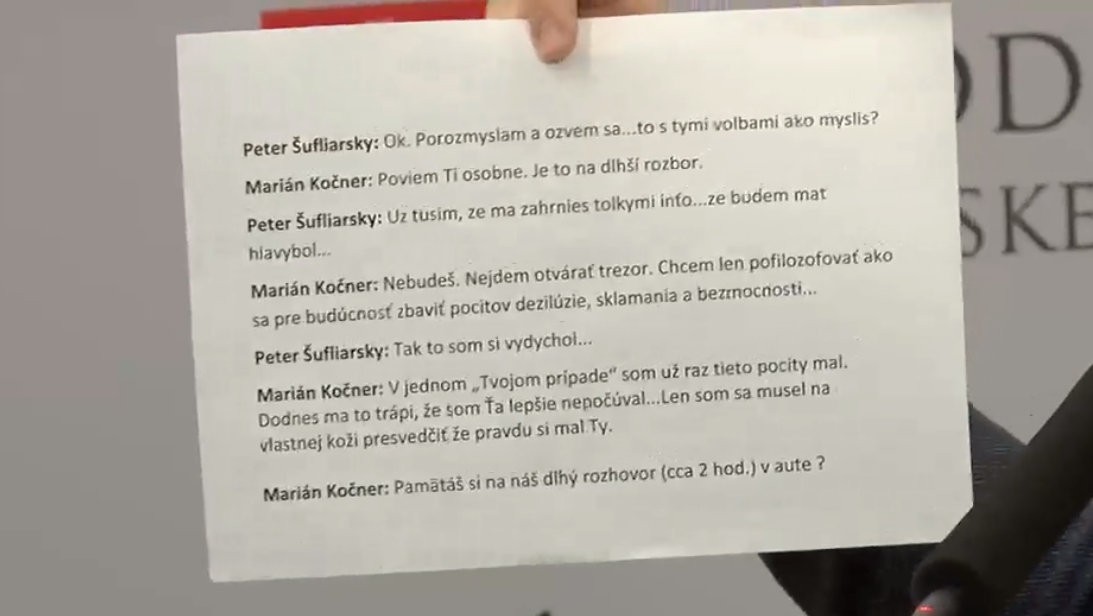 BRATISLAVA / Igor Matovič zverejnil sedem sms správ zo 430, ktoré si mal medzi sebou poslať prvý námestník Generálnej prokuratúry Peter Šufliarsky a Marian Kočner. Deň pred zverejnením prichádzali Matovičovi výhražné správy, aby to nerobil. Počas tlačovej konferencie priznal, že sa on sám v roku 2010 stretol s Kočnerom za účelom informácie, ktorú mu chcel Kočner zveriť.