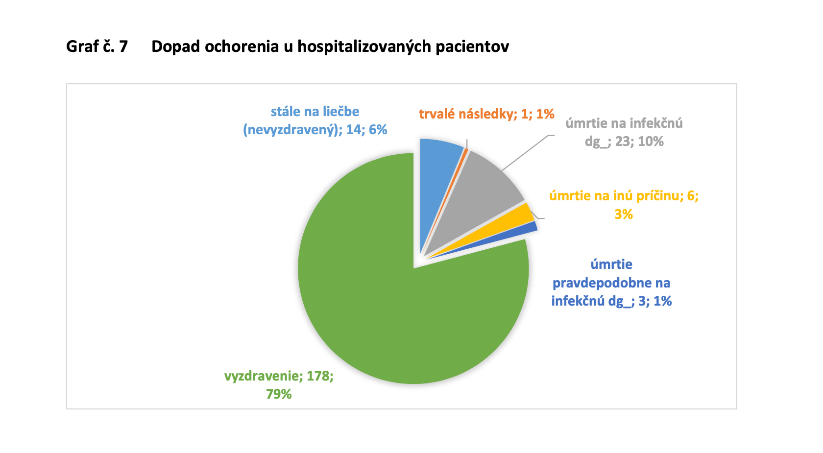 Doposiaľ sa vyliečilo 79% z celkového počtu hospitalizovaných. V 32 prípadoch došlo k úmrtiu pacientom, ktorí mali potvrdené ochorenie Covid-19. Z nich 23 bolo potvrdené úmrtie spôsobené koronavírusom, v troch prípadoch bolo určenie pravdepodobne na následky koronavírusu a v šiestich prípadoch išlo o inú príčinu.