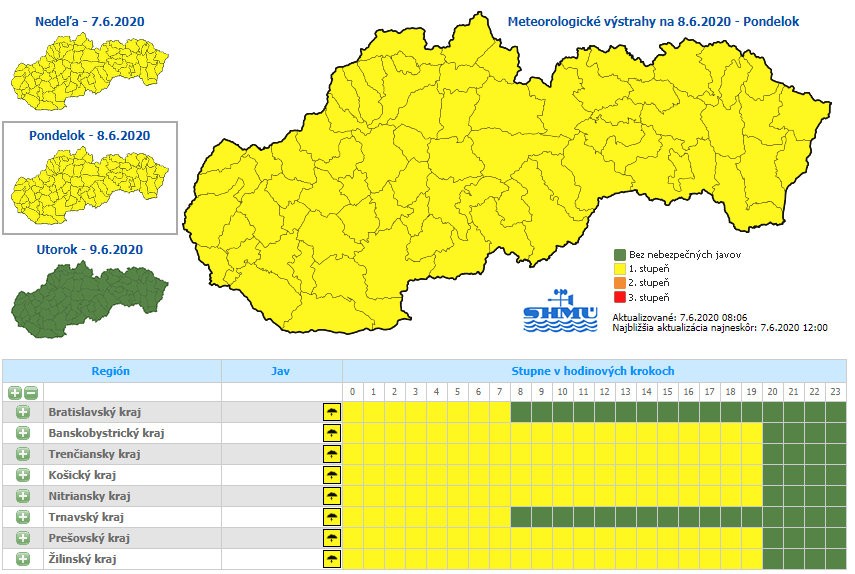 Meteorológovia vydali na nedeľu poobede výstrahu 1. stupňa pred búrkami. Tá platí od 15.00 hodiny vo všetkých krajoch okrem Trnavského a Bratislavského.