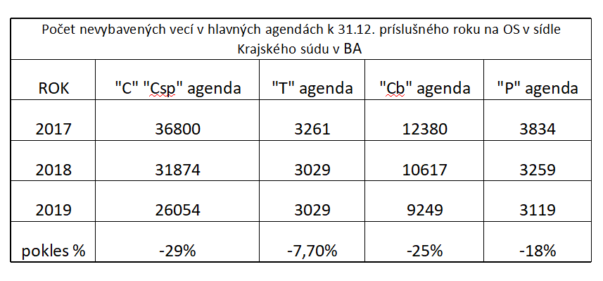 Máme za to, že takúto zásadnú zmenu by odôvodňovala nefunkčnosť súdnej sústavy. Z aktuálnych dlhodobých štatistických údajov minimálne za posledné 3 roky však vyplýva, že v rámci bratislavského kraja na okresných súdoch dochádza k plynulému znižovaniu stavu nevybavených vecí v jednotlivých hlavných agendách (viď tabuľka).