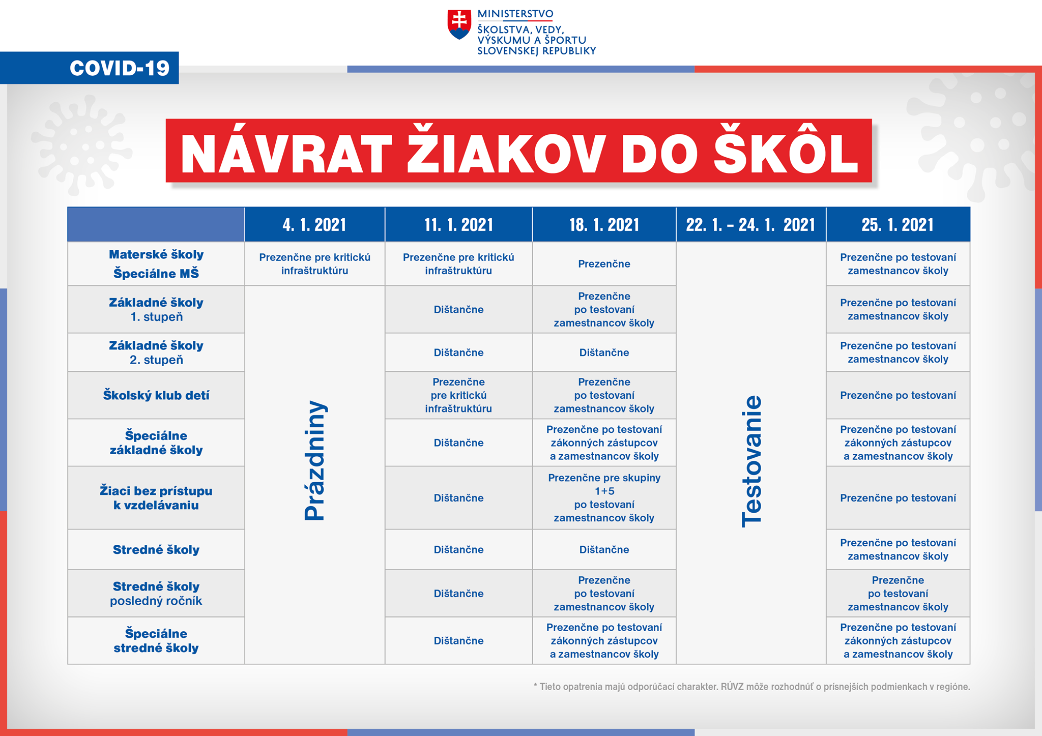 Od 4. januára materské školy pokračujú v aktuálnom režime, v ktorom sú buď uzatvorené alebo fungujú pre kritickú infraštruktúru či rodičov, ktorým vyplýva z povahy práce, že ju nemôžu vykonávať z domu. Pre základné a stredné školy pokračujú do 10. januára prázdniny.
