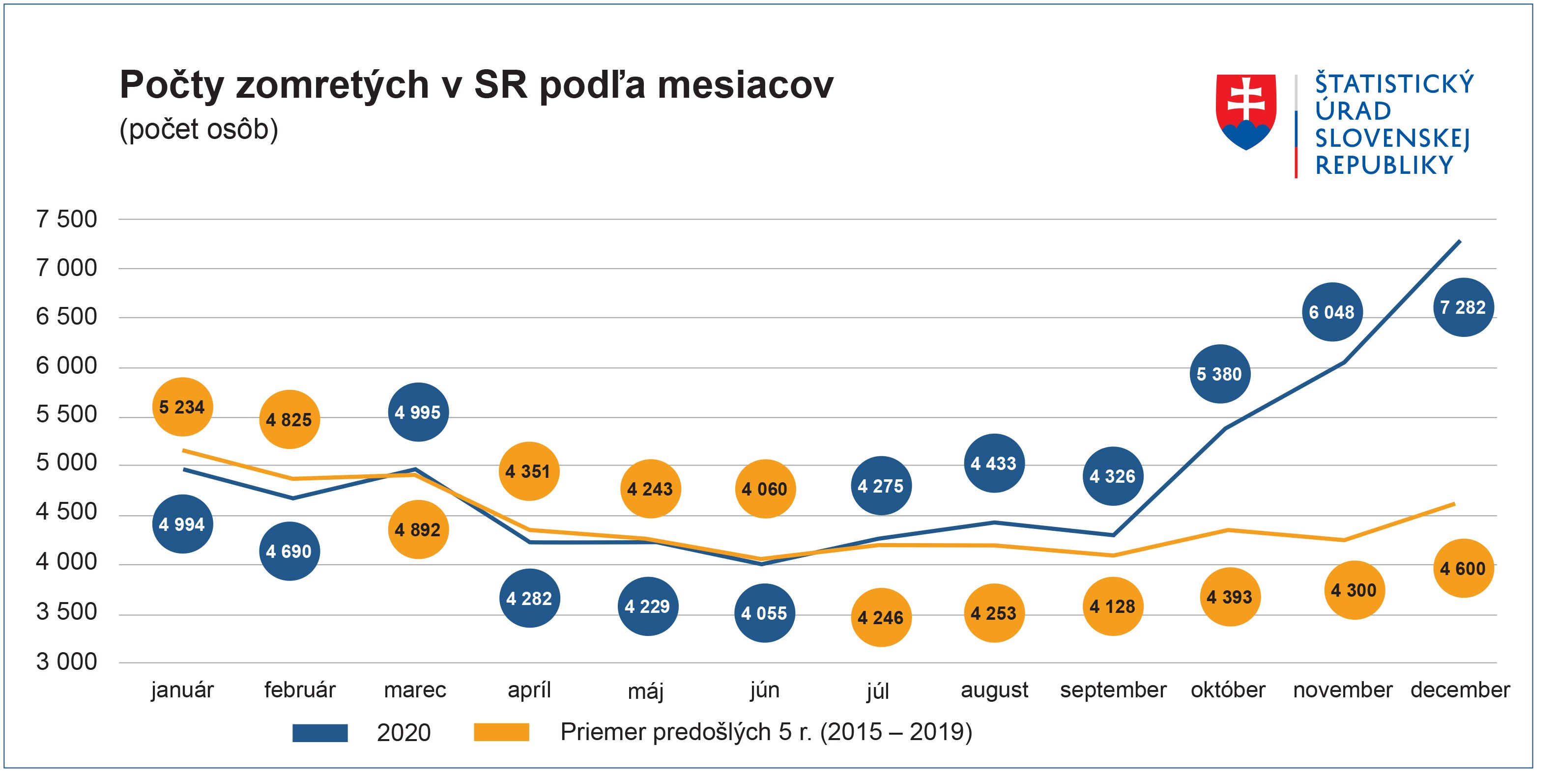 V roku 2020 zomrelo na Slovensku 59 000 ľudí, je to takmer o 5,5 tisíca osôb ako zomieralo v priemere za posledných päť rokov. Počet úmrtí tak vzrástol o 10,2 %.