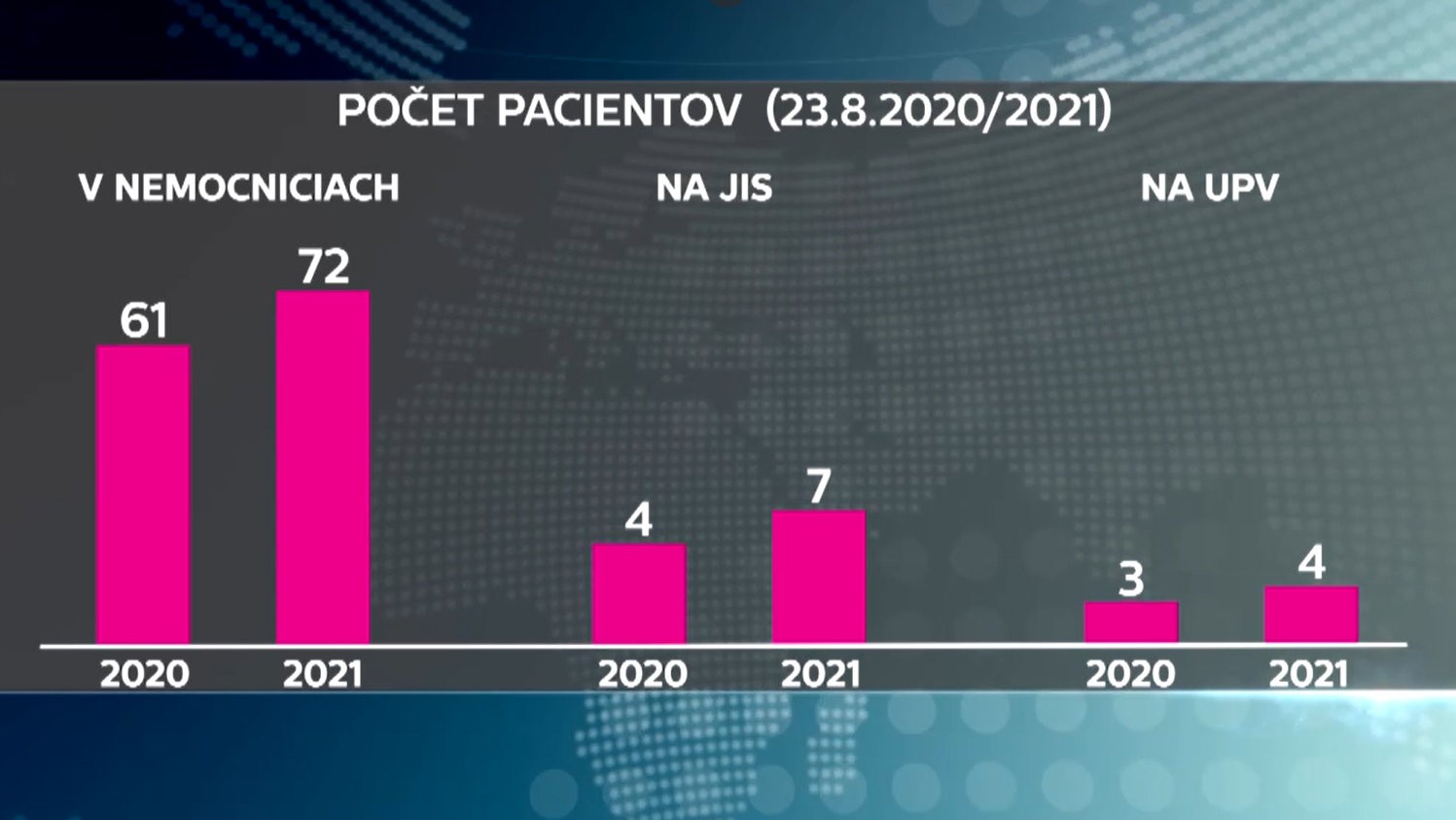 Za tento víkend sa počet pacientov na Covidovom oddelení v Univerzitnej nemocnici v Bratislave zdvojnásobil. "Posledné dva mesiace sa počet hospitalizovaných pohyboval približne na hranici piatich pacientov. Za posledný víkend nám nárazovo pribudlo 5 pacientov s týmto ochorením. Z týchto desiatich pacientov, deviati sú nezaočkovaní. Pacient, ktorý bol zaočkovaný má iba mierny priebeh a čoskoro bude z nemocnice prepustený," povedala hovorkyňa Univerzitnej nemocnice v Bratislave Eva Kliská.
