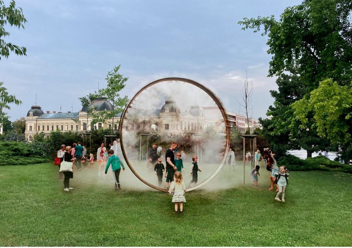 „Klimatický kruh je silný vizuálny prvok, svojím umiestnením rámujúci budovu starej mestskej radnice, dnešného Ponitrianskeho múzea. Je doplnený o vodnú paru, ktorá svojou neustále meniacou sa štruktúrou predstavuje nevyspytateľnosť dnešných klimatických zmien.“