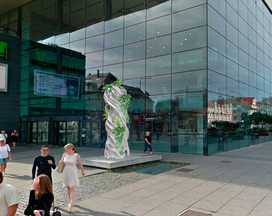 „Gyroidná fúzia je zhluk 3D tlačených telies, ktoré boli vymyslené v 70. rokoch vedcom Alanom Schoenom z NASA. Vo verejnom priestore vystupujú ako umelecké skulptúry vytvárajúce nový domov pre hmyz a rastliny. Z akejkoľvek bunky objektu totiž dokáže rásť zeleň bez toho, aby korenila v zemi.“