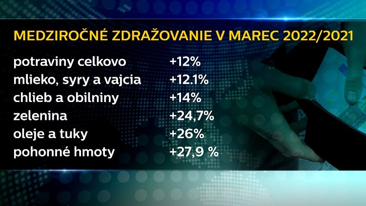 "Medziročná inflácia dosiahla hranicu 10,4 percent a bola vyššia ako vo februári. Medzimesačné ceny vzrástli o 1,7 percenta," prináša zlé správy hovorkyňa Štatistického úradu Slovenskej republiky Jana Morháčová. Problémom sú hlavne potraviny, vo všetkých deviatich sledovaných položkách ceny rapídne stúpli.