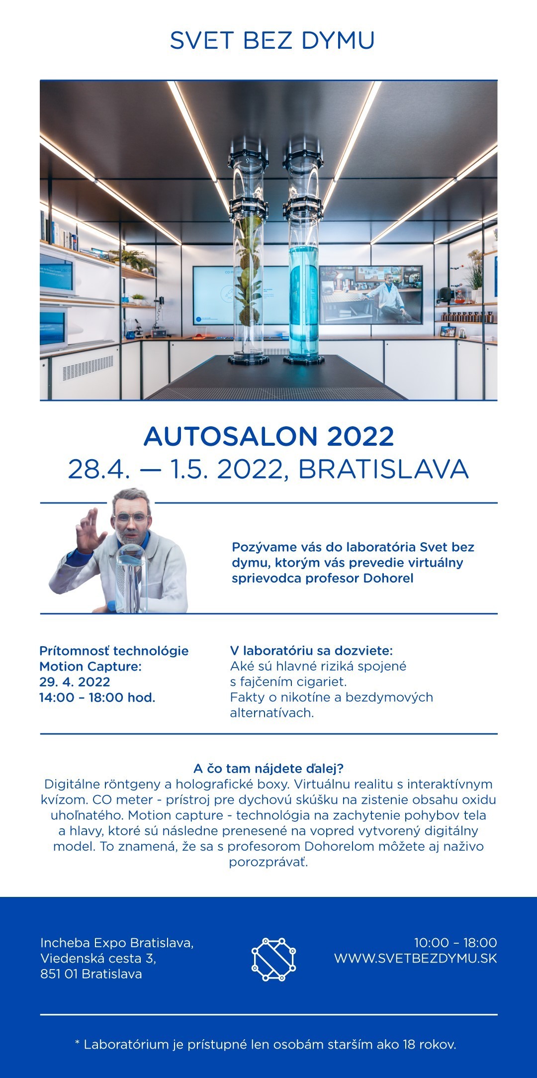V laboratóriu „Svet bez dymu“, ktoré je prístupné len osobám starším ako 18 rokov, sa dozviete, aké sú hlavné riziká spojené s fajčením cigariet a množstvo faktov o nikotíne či bezdymových alternatívach. Originálne, na Slovensku vyvinuté, laboratórium využíva najmodernejšie technológie, ako sú digitálne röntgeny a holografické boxy. Výnimočné je najmä využitie technológie Motion Capture, vďaka ktorej ožíva postava samotného profesora Dohorela. Hlas a pohyby mu prepožičal slovenský herec Peter Gecík. Profesor Dohorel dokáže s návštevníkmi komunikovať, a to vďaka unikátnej interaktívnej technológii. Umožňuje to 18 bezdrôtových snímačov umiestnených na tele herca, špeciálne rukavice a najmodernejší kamerový systém. Ten využíva infračervené lúče, ktoré zachytí aj oku neviditeľné vlnové dĺžky. Technológia Motion Capture live bola na Slovensku použitá vôbec prvýkrát. Laboratórium môžu dospelí návštevníci preskúmať na autosalóne v Incheba Expo Bratislava, kde bude umiestnené do 1. mája. So „Svetom bez dymu“ a profesorom Dohorelom sa môžete zoznámiť taktiež na www.svetbezdymu.sk.