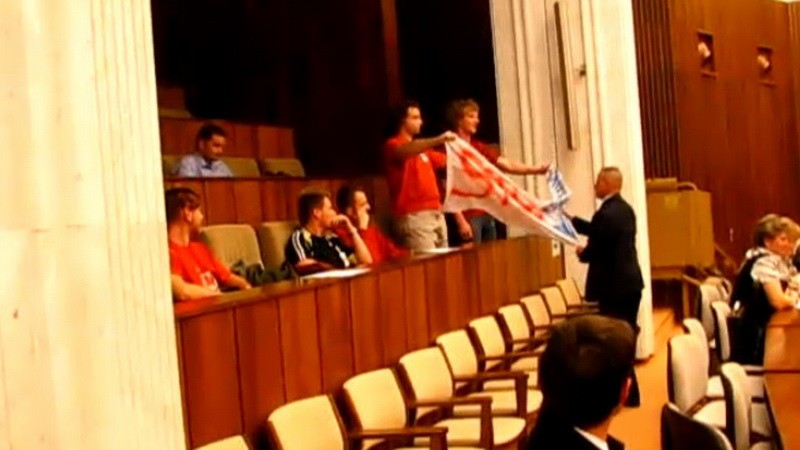 Na parlamentom balkóne chlapi odrazu rozostreli veľký transparent a začali do pléna kričať: "Stop likvidácii železníc, stop likvidácii železníc!" Ich protest však nezostal bez odozvy, keďže aktivisti porušili rokovací poriadok Národnej rady.