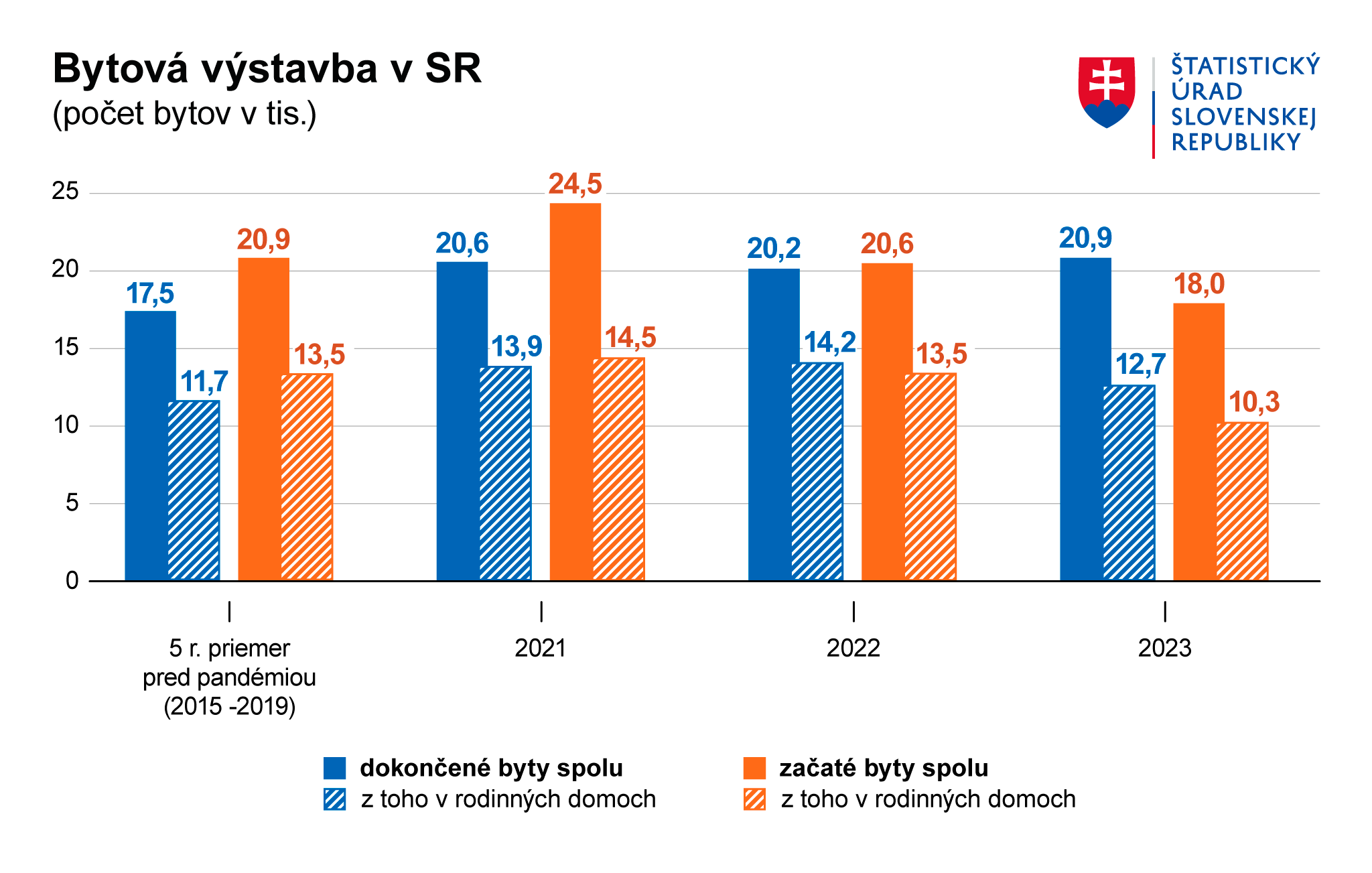 BRATISLAVA / Počas roka 2023 sa v SR dokončilo spolu 20 891 bytov, čo bol len o 3,3 percent vyšší počet ako v roku 2022. Z dlhodobého hľadiska bola aktuálna výstavba dynamickejšia ako pred pandémiou, počty dokončených bytov o pätinu prevyšovali predpandemický priemer. Aktuálny počet dokončených bytov v roku 2023 predstavoval druhú najvyššiu hodnotu od vzniku samostatného Slovenska. Vyšší počet ako vlani bol len v roku 2020. Informoval o tom Štatistický úrad (ŠÚ) SR.