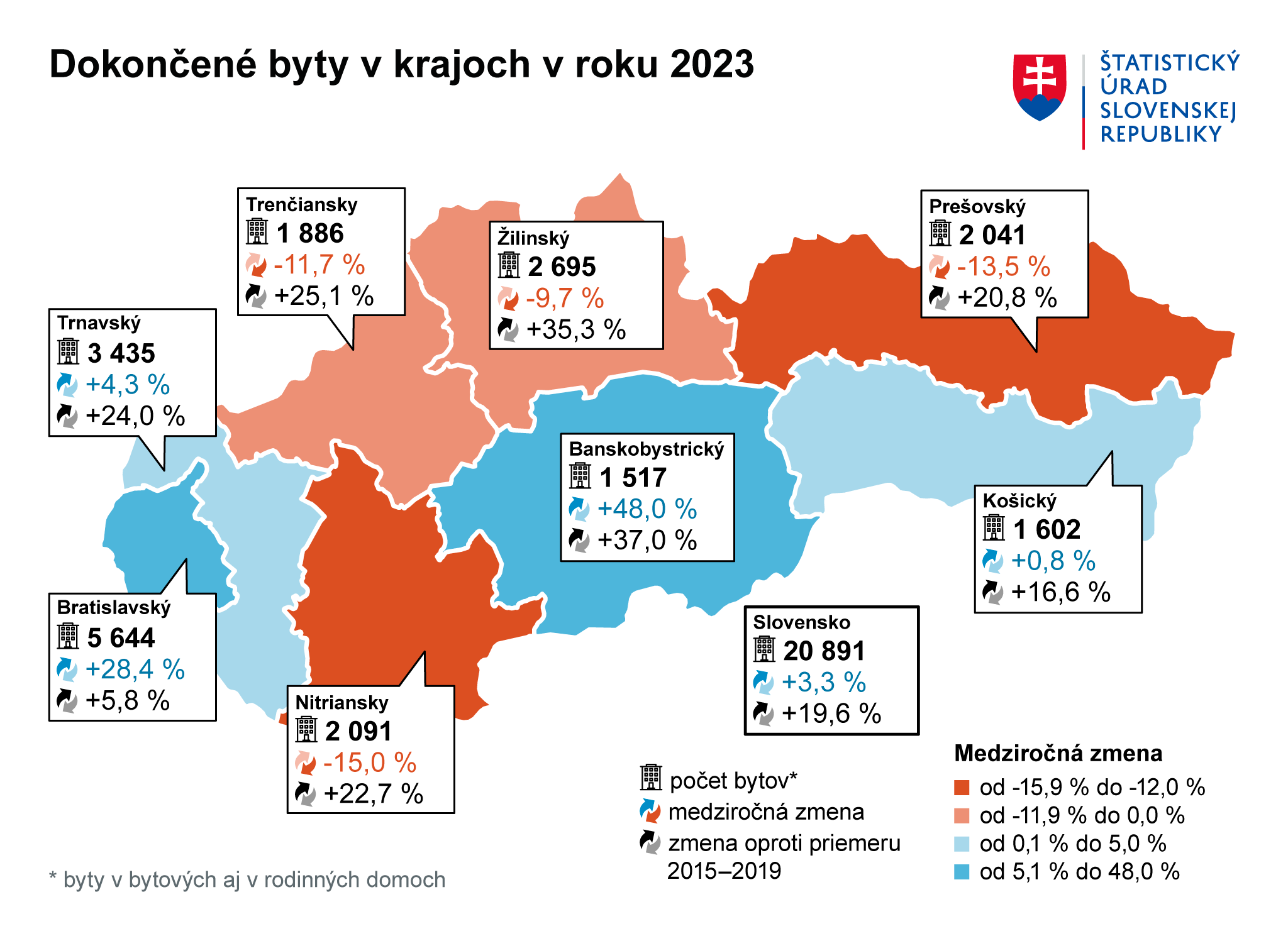 Naďalej bola najväčšia koncentrácia výstavby v regióne okolo hlavného mesta, viac ako štvrtina z bytov postavených v SR v roku 2023 bola práve na území Bratislavského kraja. Z hľadiska regionálneho vývoja medziročne vzrástol počet dokončených bytov v polovici krajov SR, najdynamickejšie v Banskobystrickom kraji (takmer o polovicu) a v Bratislavskom kraji (o viac ako štvrtinu).