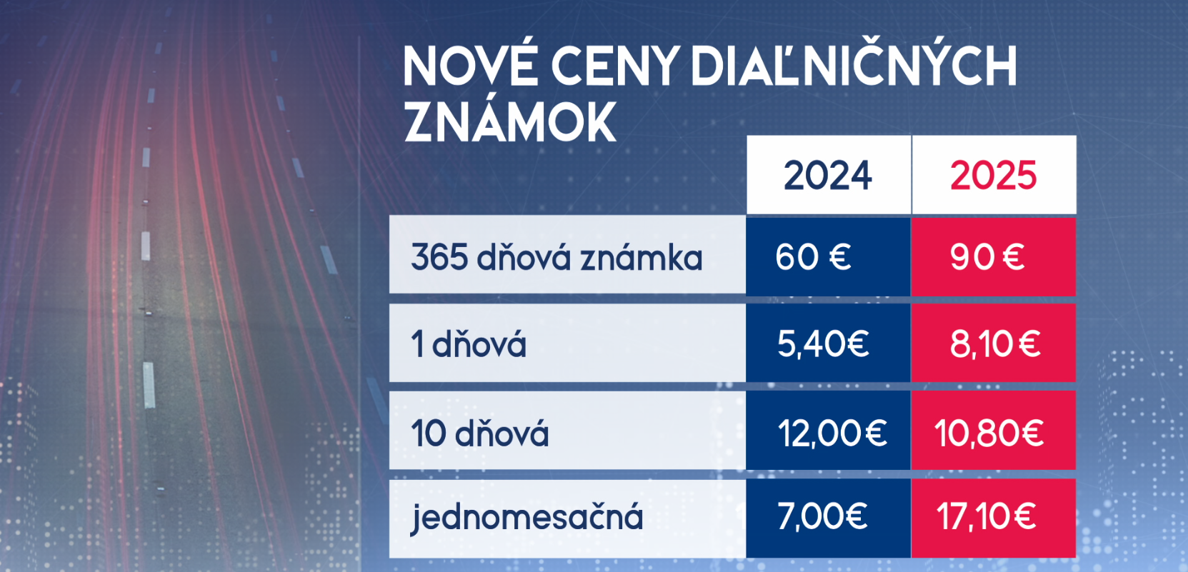 Vláda zavelila na ozdravenie verejných financií a účet za ich zlý stav zaplatia aj motoristi. Rok užívania diaľnic ich bude stáť po novom o 50 percent viac ako dnes. "90 eur je výška, ktorú sme my vyhodnotili ako ešte prijateľnú pre motoristov," povedal Igor Choma, štátny tajomník ministerstva dopravy. "Podľa mňa už aj tých 60 eur bolo veľa," povedal jeden z vodičov. "Nepáči sa mi to, nakoľko vláda sľubovala, že nebude zvyšovať poplatky," povedal vodič.
