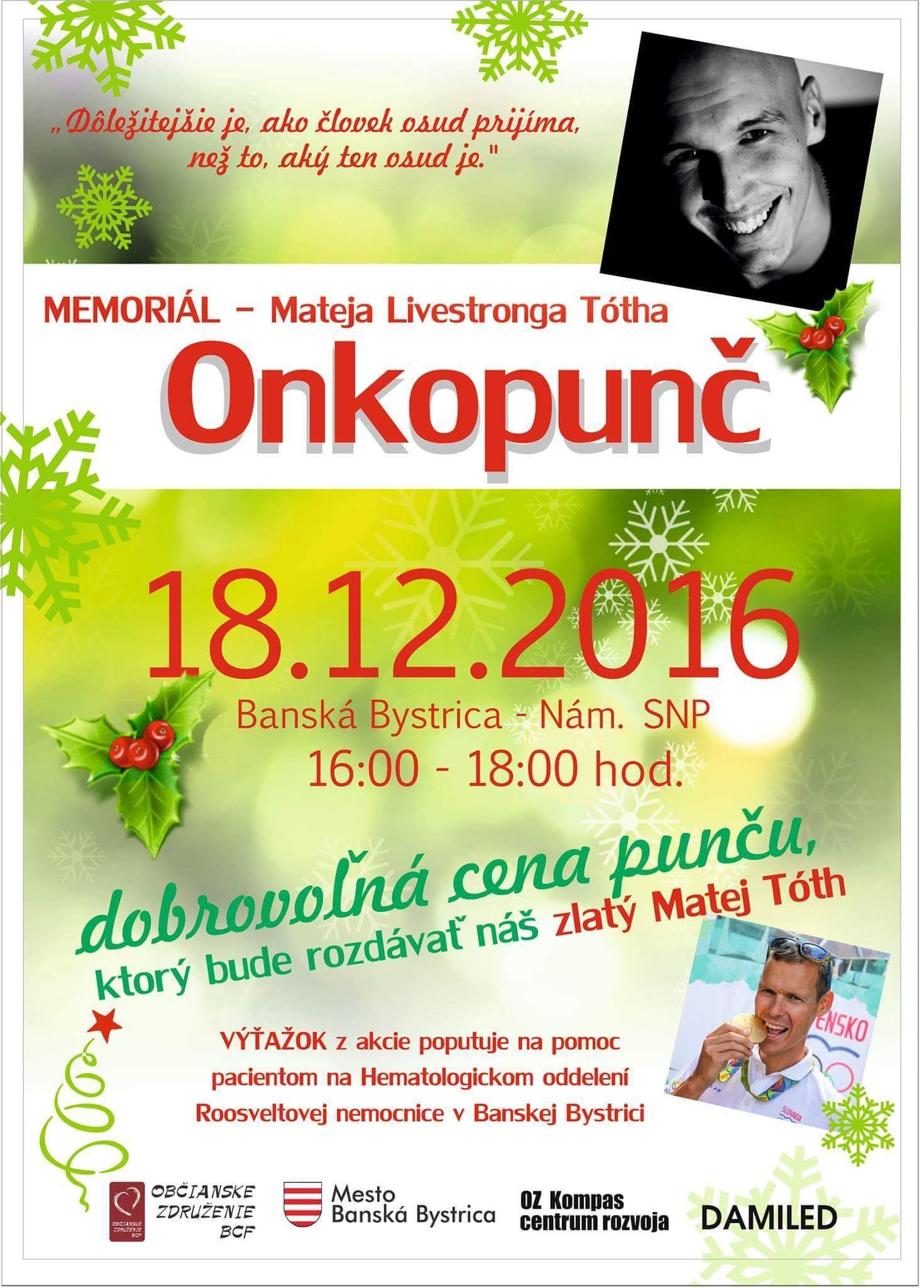 BANSKÁ BYSTRICA / V sobotu, 18. decembra, sa bude na Námestí SNP V Banskej Bystrici nalievať onkopunč. Servírovať ho bude v rámci charitatívnej akcie Memoriál Mateja Livestronga Tótha zlatý olympijský medailista z Rio de Janeiro Matej Tóth.