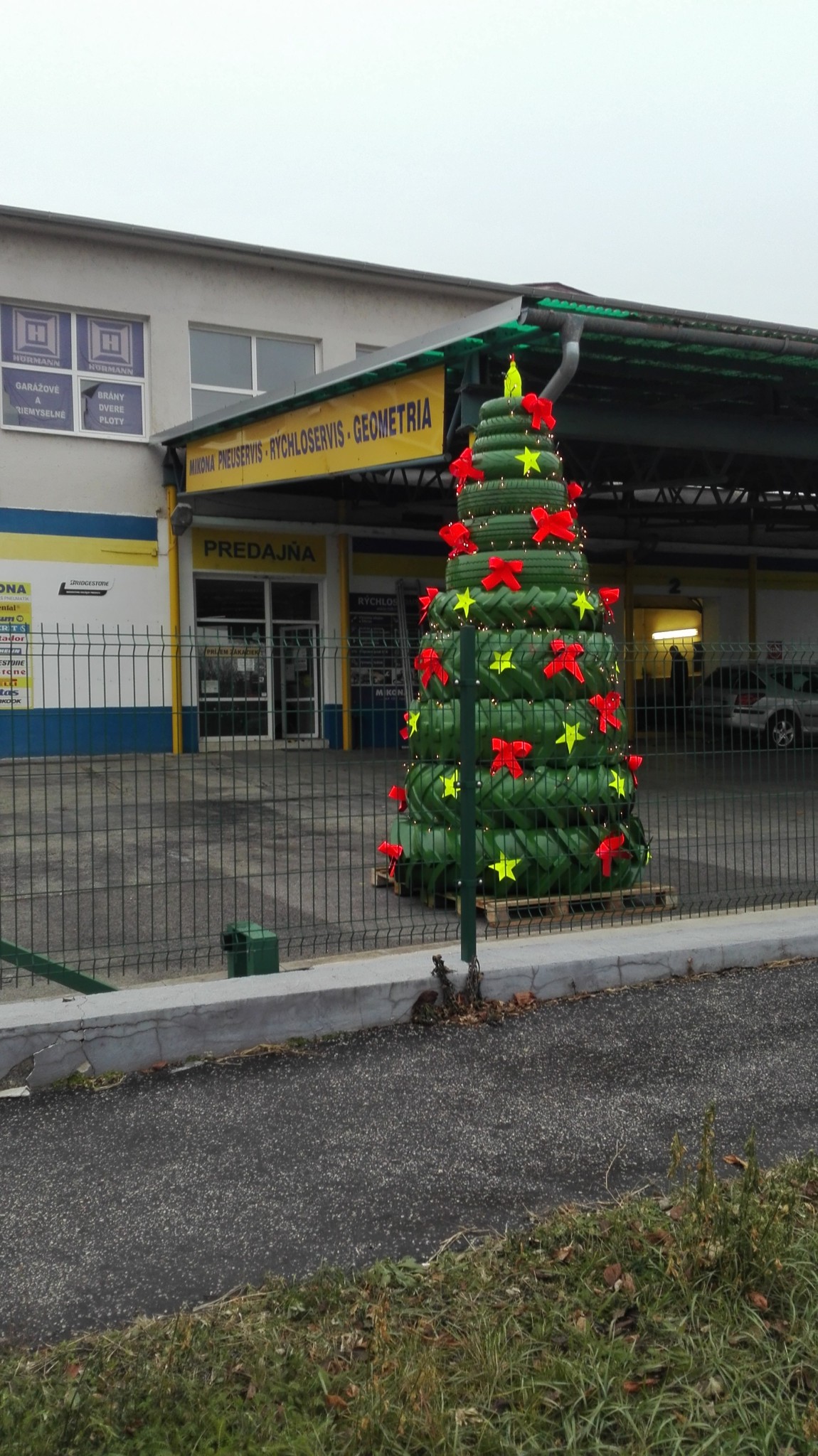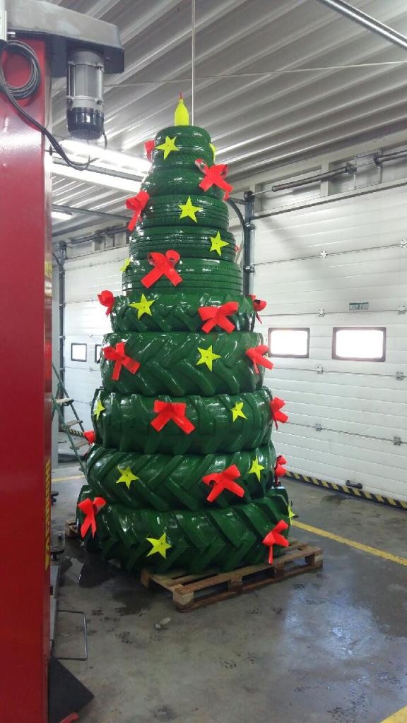 NITRA / V nitrianskom pneuservise si urobili stromček "po svojom". Naskladali na seba staré recyklované pneumatiky a vytvorili takmer 4-metrový symbol Vianoc.