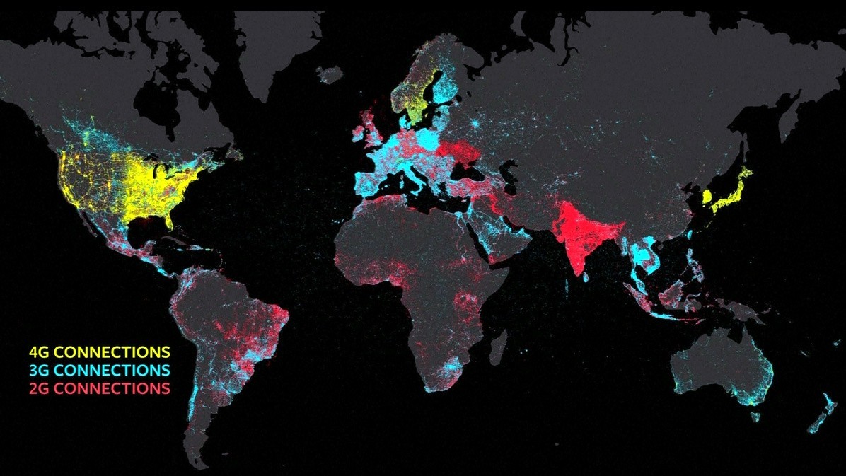 Červená farba na mape označuje miesta, kde je dostupné 2G pripojenie, modrá je 3G a žltá 4G. Zvyšok je internetová tma: