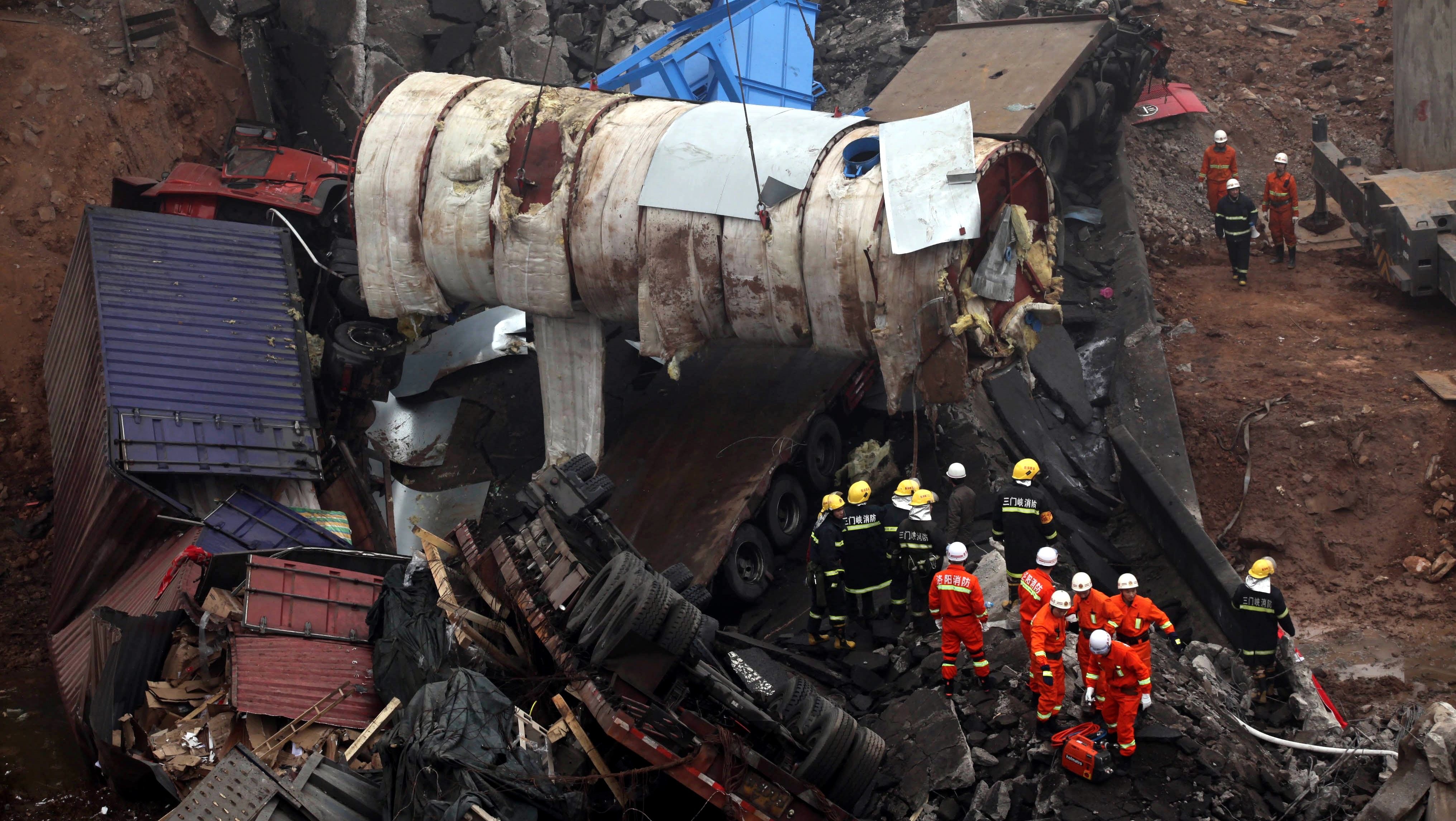 Podľa niektorých informácií je zničený až 80 metrov dlhý úsek diaľnice neďaleko mesta San-men-sia. Zábery z čínskej televízie ukázali trosky automobilov popadaných z výšky 30 metrov na zem a nákladný automobil visiaci na hrane mosta.