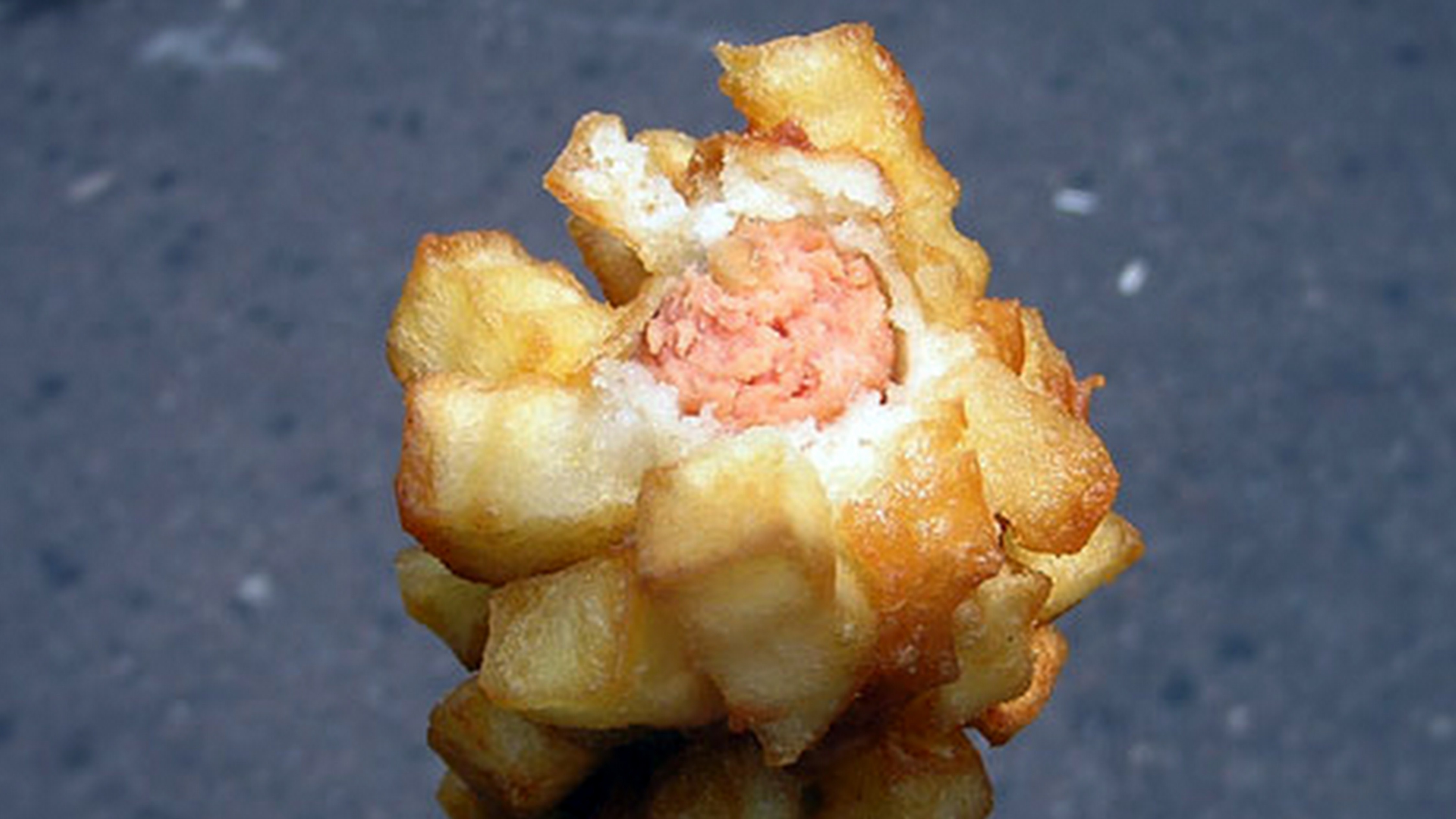 Nemôžete sa pri stánku rozhodnúť, či si dáte párok v rožku alebo hranolky s kečupom? Táto "pochúťka" vyrieši dilemu za vás. Párok na tyčke obalený vrstvou vyprážaných hranoliek je kalorickou bombou, hlad však zaženie len na chvíľu.