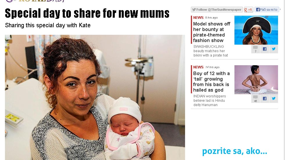 LONDÝN / Slovenka Zuzana Bučková porodila v Londýne dcéru Nicole. Nebolo by na tom nič zvláštne, keby neporodila v rovnaký deň ako vojvodkyňa z Cambridgeu Kate. A dostala sa aj do denníka The Sun, teda v týchto dňoch na oslavu následníka trónu The Son.