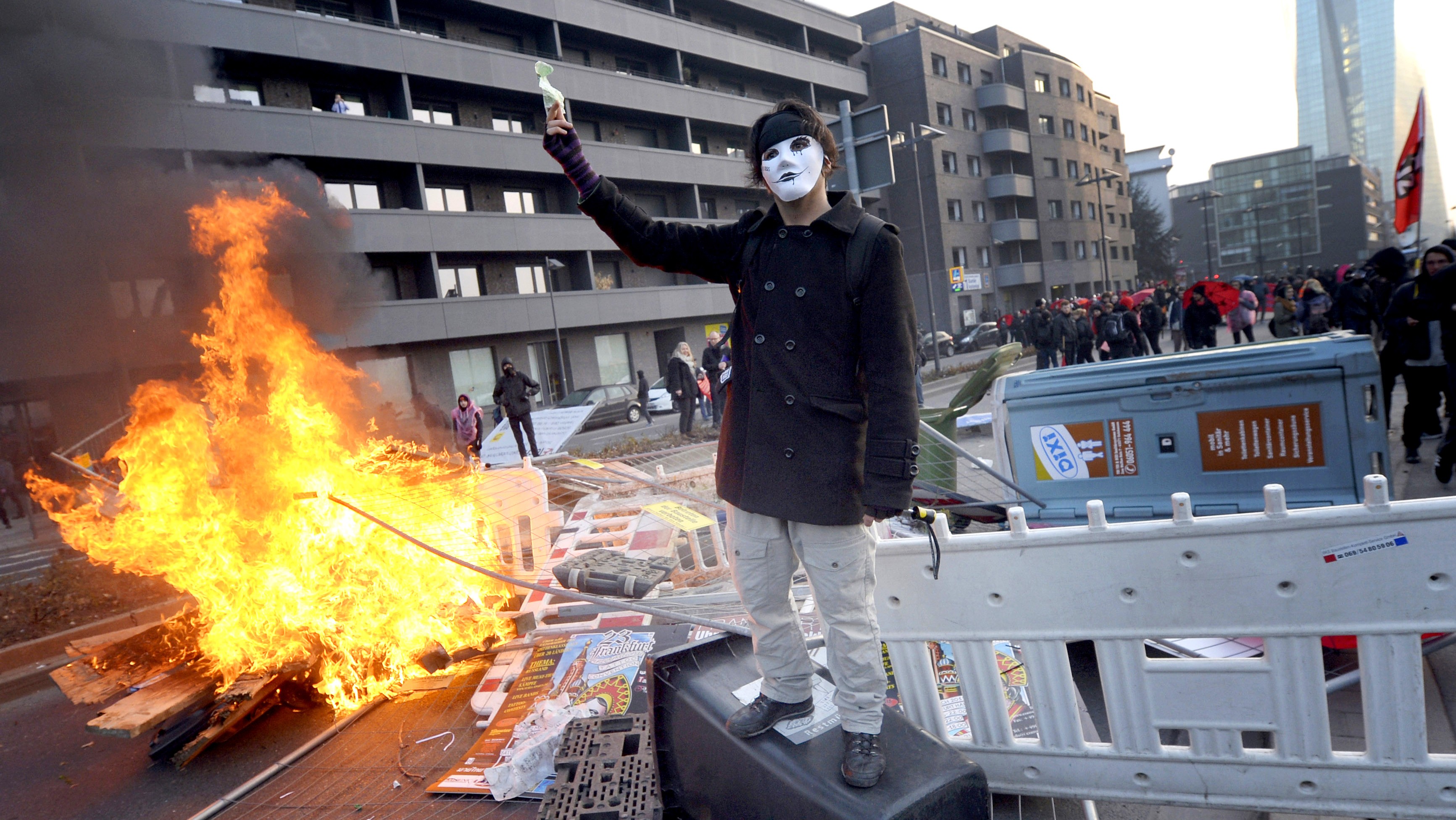 V noci z utorka na stredu horeli v meste smetiaky i autá. Demonštranti pred budovou starej opery hádzali kamene na policajtov, pričom jedného zranili, informuje nemecký denník Frankfurter Allgemeine.