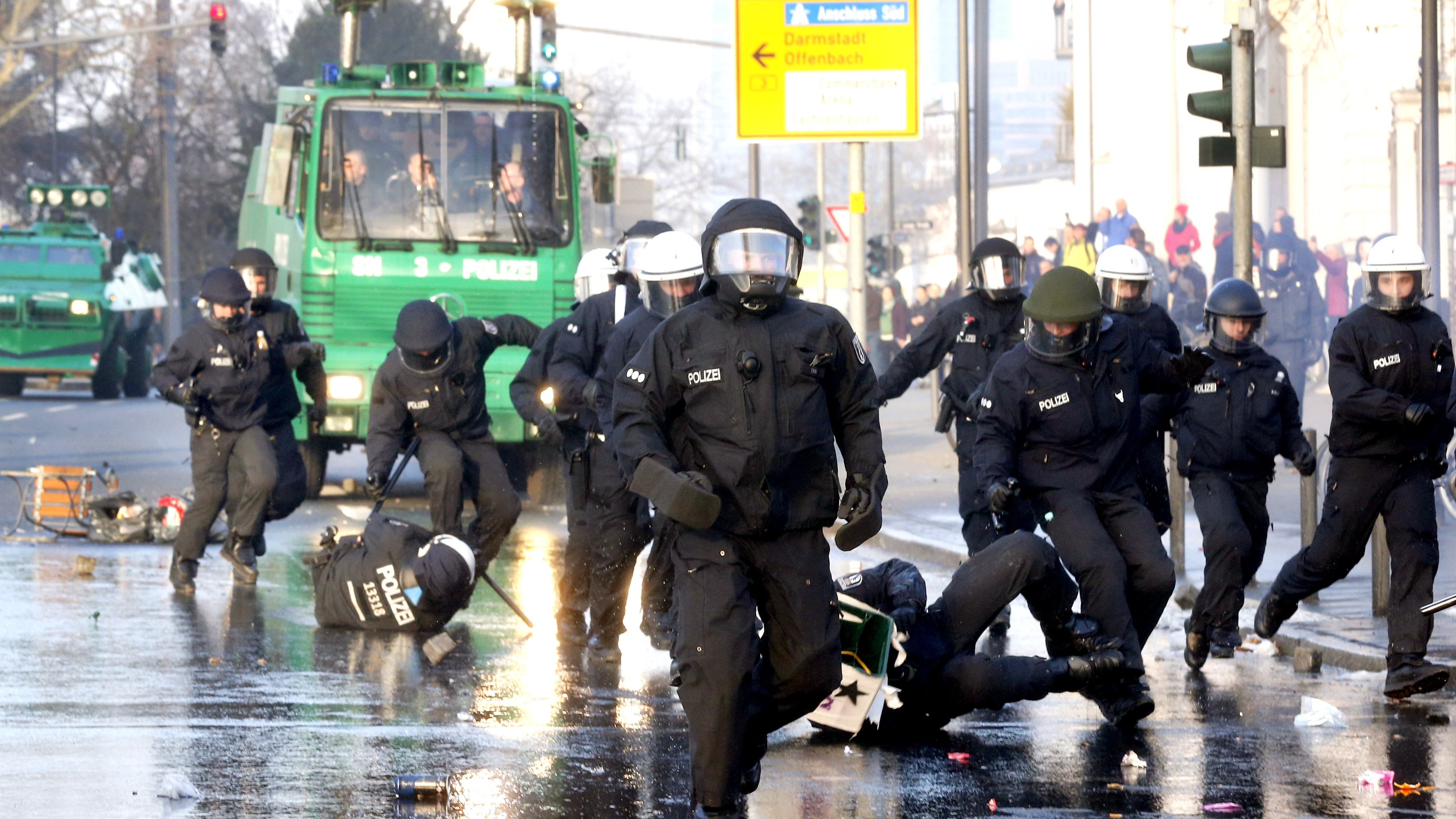 Frankfurtská polícia si na pomoc zavolala tisíce mužov zákona. Pripravili tiež desiatky vodných diel a vrtuľníky. Okolo budovy postavila polícia zátarasy a namontovala ostnantý drôt.