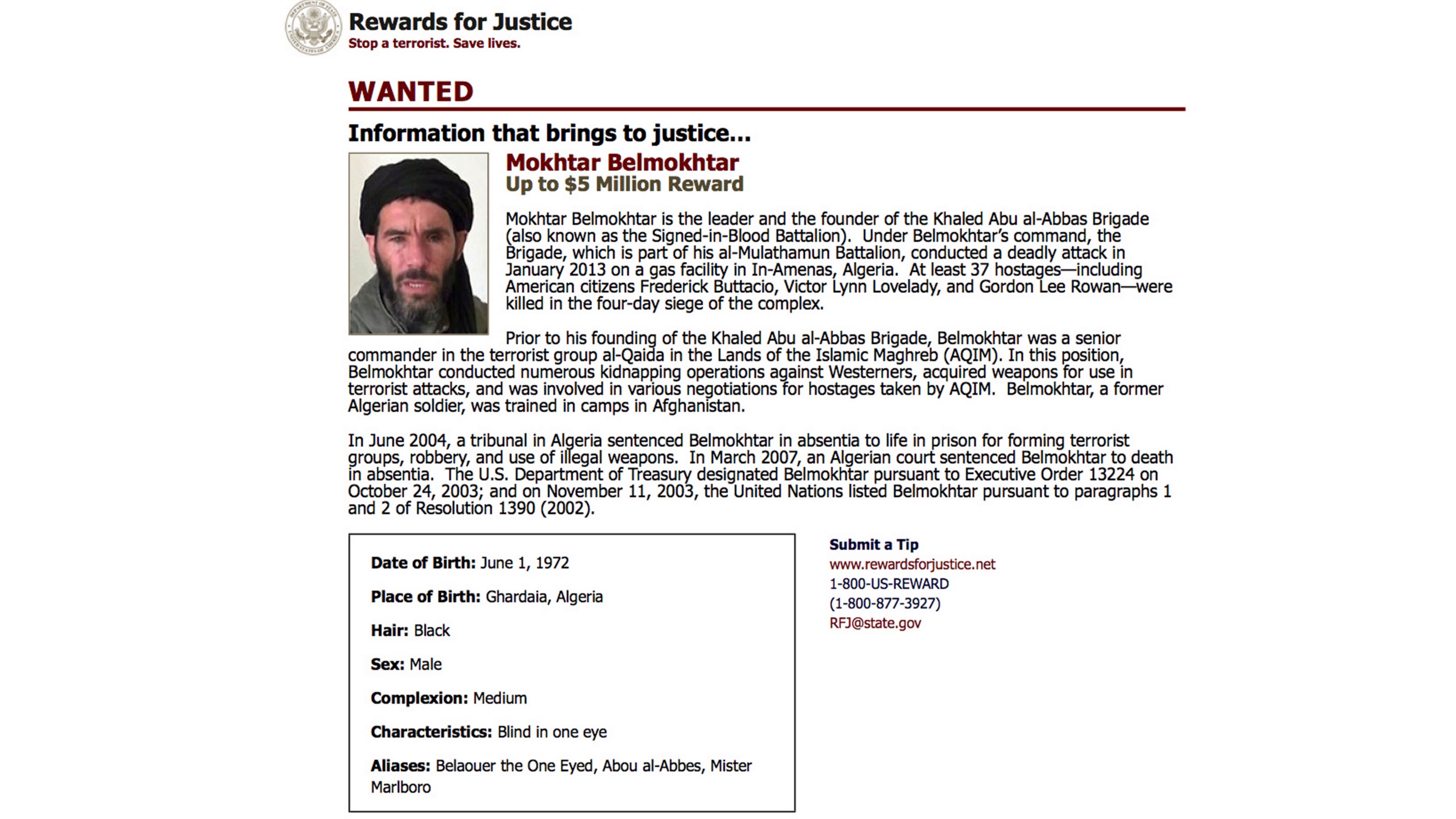 "Belmochtár má za sebou dlhú históriu ako vodca teroristických akcií a operácií po celej severnej Afrike. Stojí na čele vlastnej organizácie Al-Murabiton, ktorá je napojená na Al Káidu," vyhlásil hovorca Pentagonu Col Steve Warren.