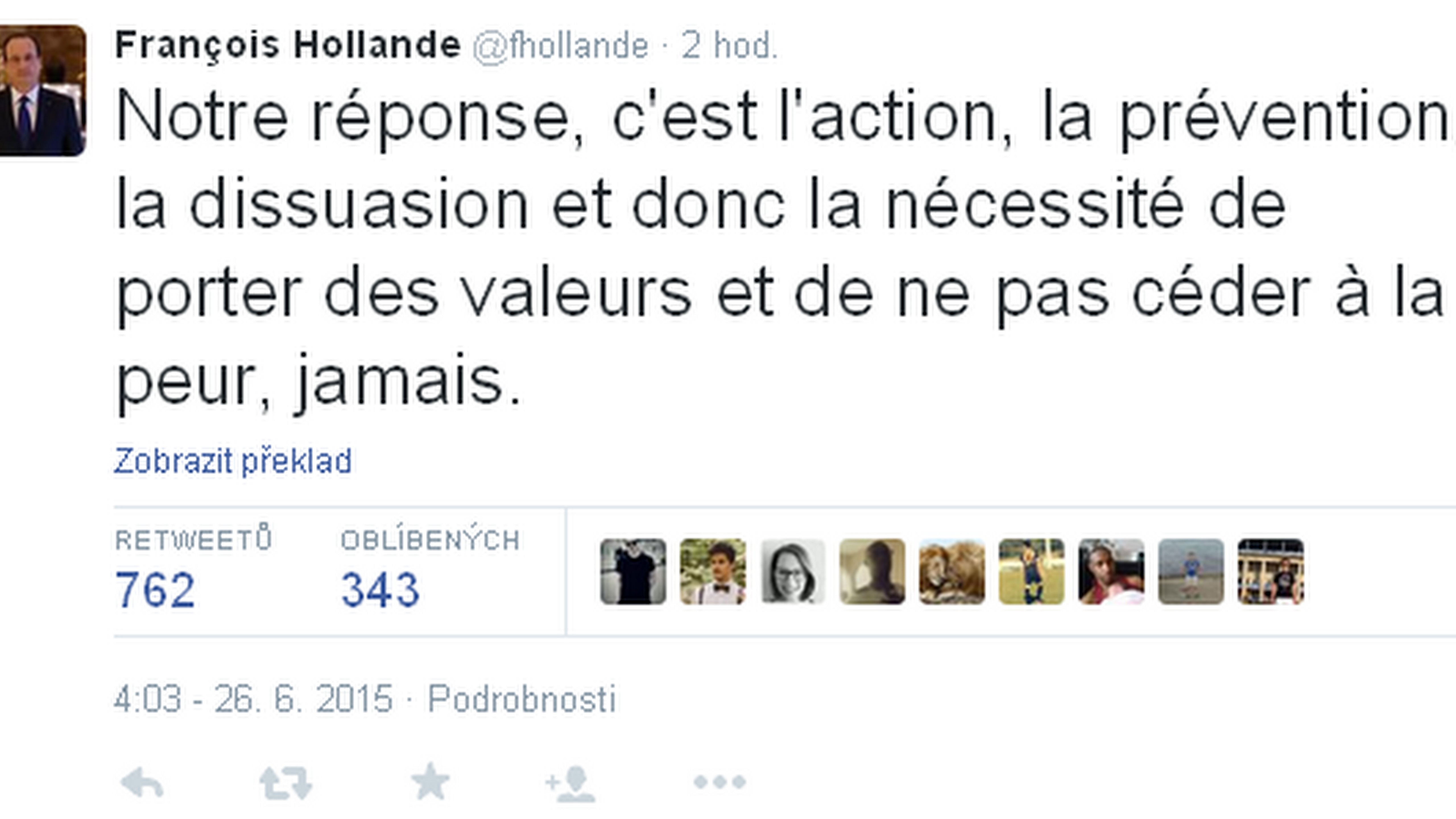 "Naša odpoveď je akcia, prevencia, odstrašovanie a nevyhnutnosť brániť naše hodnoty a nikdy sa nepoddať strachu, nikdy," napísal na sociálnu sieť Twitter.